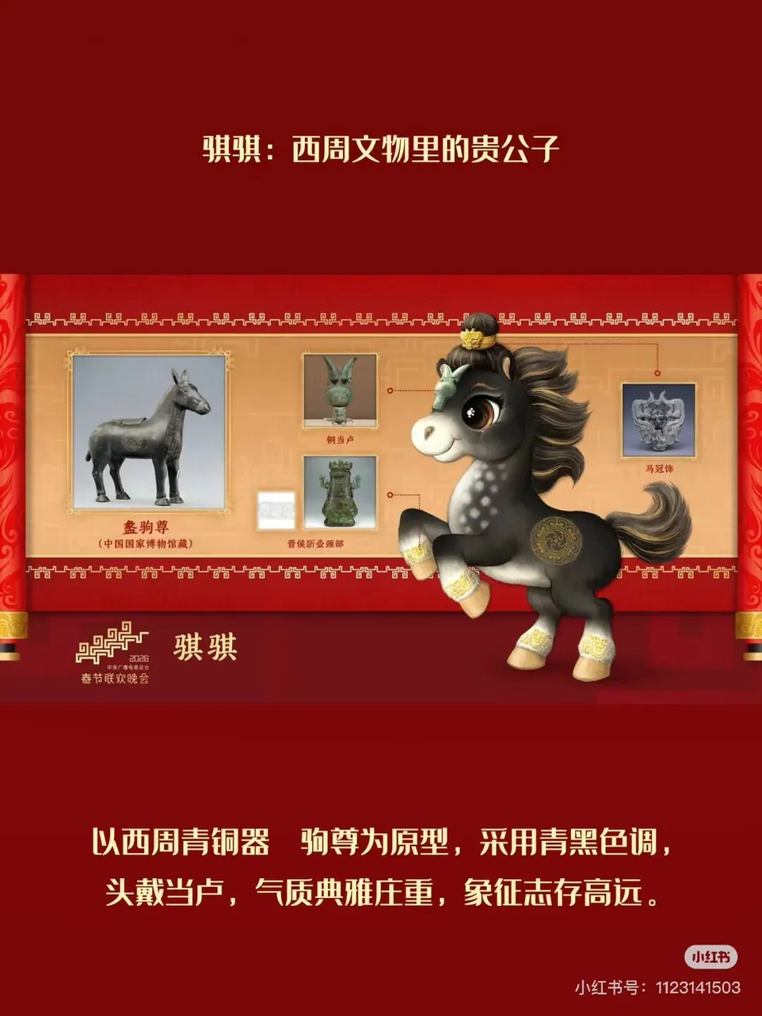 骐骐:参考西周盠驹尊,青黑色配色,头戴当卢、高束发髻,象征朝气蓬勃与奋进精神。