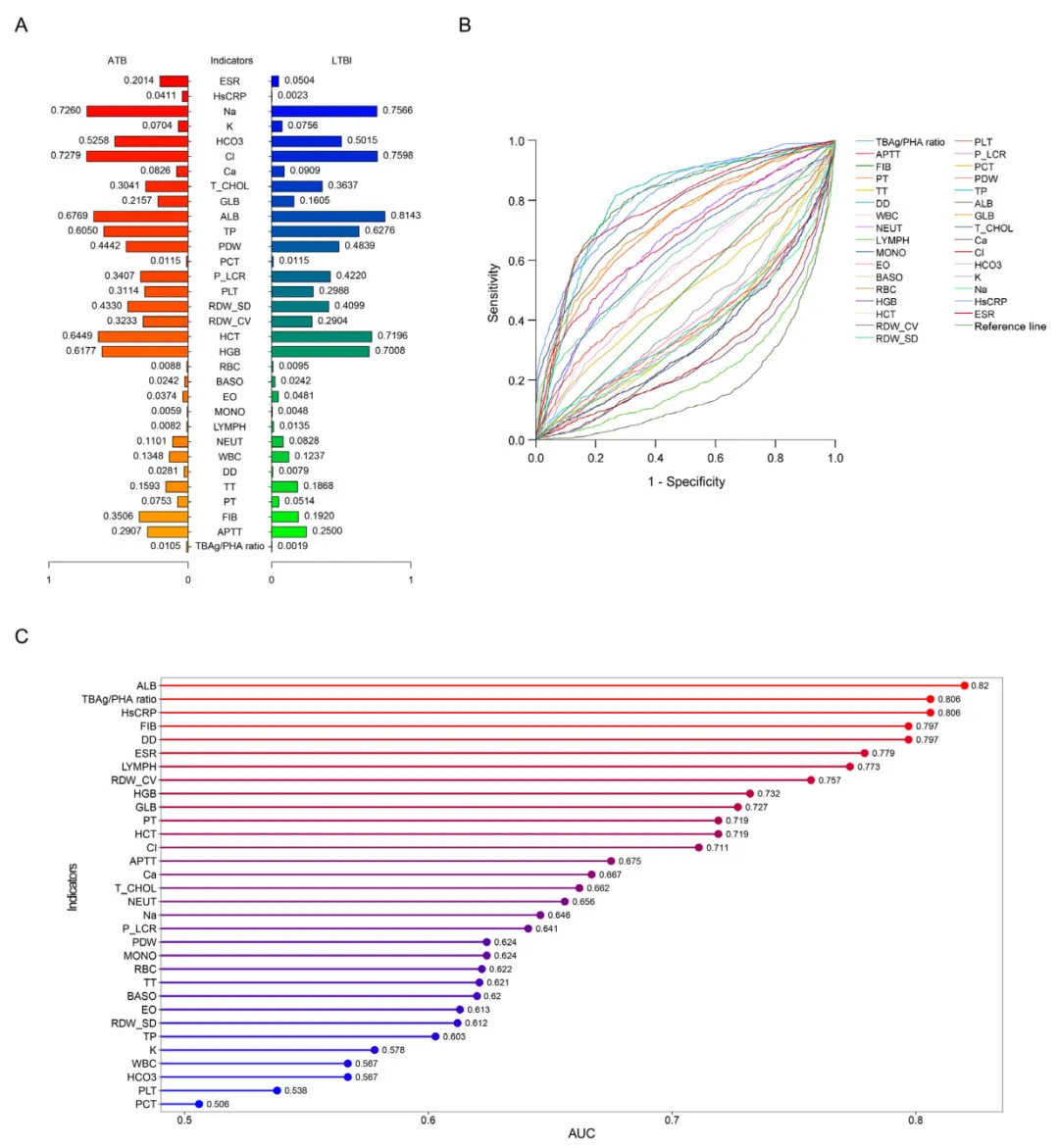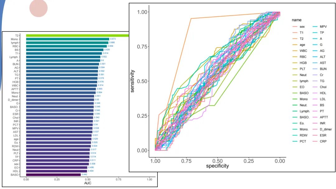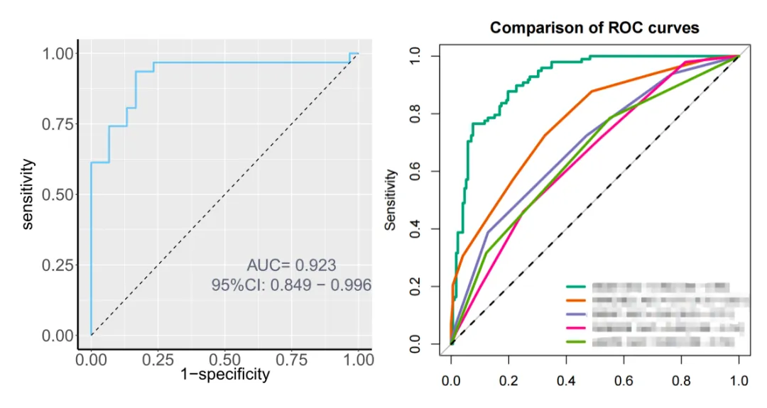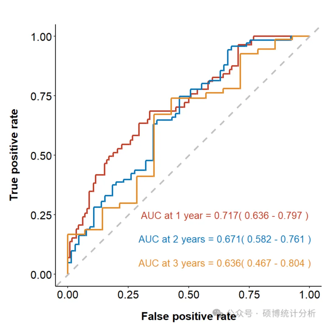 ROC曲线(Receiver Operating Characteristic curve)用于评估模型区分事件组与非事件组的能力;AUC(曲线下面积)反映模型总体判别性能。