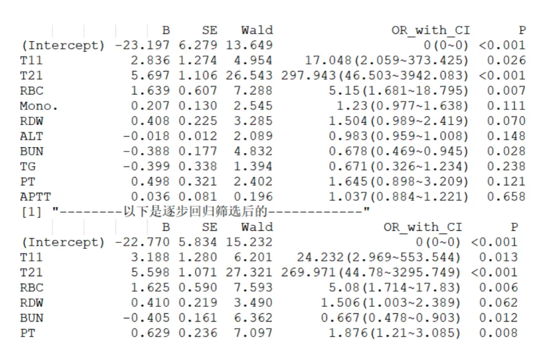 多因素回归表格中显著性的问题:在模型解释中,单个变量的统计显著性(P值)并不是决定其是否保留的唯一标准。对于预测模型而言,更重要的是变量整体的预测能力与模型稳定性。一个变量即使P值略高,也可能提升模型的拟合度、改善判别能力(如AUC)或增强模型的临床可解释性。因此,我们不应机械地以P<0.05为筛选依据。但是这个是可以主观选择的,你也可以为了平衡模型复杂度与稳健性,进一步采用逐步回归(stepwise selection) 方法,在AIC(Akaike信息准则)或BIC(贝叶斯信息准则)标准下自动筛选变量,剔除对模型贡献有限的冗余因素,从而获得更简约的最终模型。该策略既避免过度拟合,又保持模型在临床应用中的简洁与可操作性。
