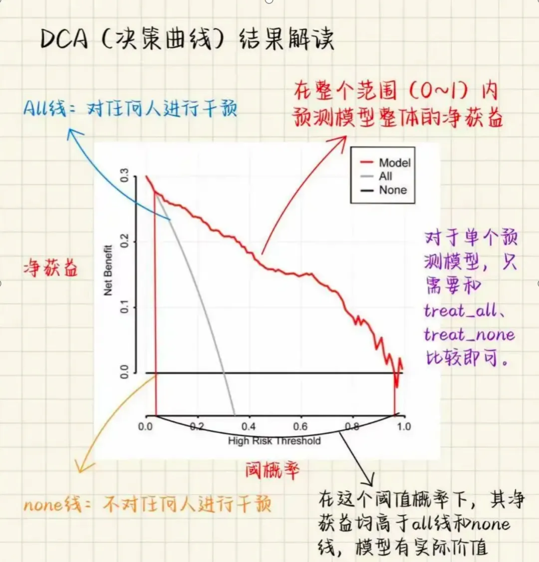 DCA曲线组成部分1)阈值概率:临床决策者采取某项干预措施的概率阈值。换言之,它是疾病的预测概率,超过该概率时,预期的治疗益处超过其带来的风险。2)净收益(Net Benefit):这是模型在特定阈值概率下的效用度量,考虑了真阳性带来的益处减去假阳性带来的损害(经适当加权)。3)净收益曲线(Net Benefit Curve)展示了在不同阈值概率下模型的净收益。通过比较不同模型的净收益曲线,可以直观地看出哪个模型在特定条件下更优。4)参考线(Reference Lines)在DCA图中,通常会包括几条参考线作为比较的基准,最常见的有:“不采取任何行动”(Treat None)的净收益线:假设没有患者被治疗,此时的净收益是零。“治疗所有患者”(Treat All)的净收益线:假设所有患者都接受治疗,这条线展示了在这种极端情况下的净收益。5)决策阈值(Decision Threshold)这是决策者做出治疗决策时考虑的阈值概率的具体值。在实际应用中,这个阈值是基于疾病的严重性、治疗的潜在风险与益处以及患者偏好等因素综合确定的。