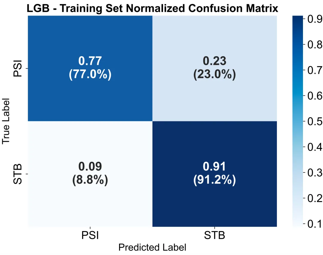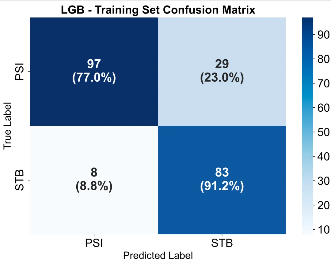 通过二维表格形式显示预测值与真实值的对应关系:对角线上的数值代表模型预测正确的样本数(真阳性与真阴性),非对角线表示预测错误的样本(假阳性与假阴性)。热图颜色深浅反映分类数量大小,颜色越深说明该类别预测越集中。通过观察混淆矩阵,可以判断模型在不同类别上的识别能力与误差类型,例如是否存在某一类被系统性误判。相比单一AUC指标,混淆矩阵能更直观地揭示模型在指定阈值下的分类性能平衡性(灵敏度、特异度、准确率)