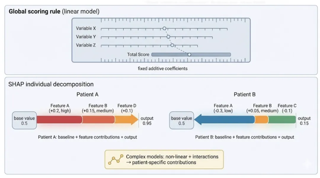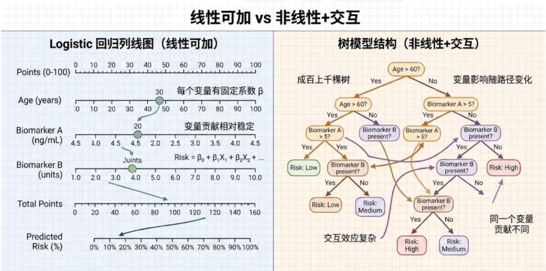 对临床同学来说,可以用一句话理解:列线图依赖“系数”,而多数机器学习模型没有一组固定可解释的系数。