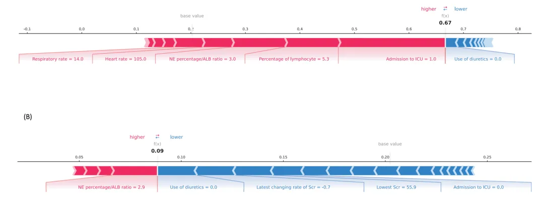 对某个具体病人,哪些因素把风险“推高/拉低”?用 waterfall plot(瀑布图) 或 force plot(力图)