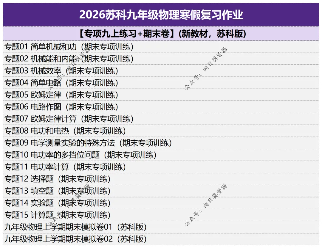 【5】2026苏科九年级物理寒假复习作业【专项九上练习+期末卷】(新教材,苏科)15专题+模拟卷+上学期复习大量精选题及考点,内含模块:题型归纳、题型通关。