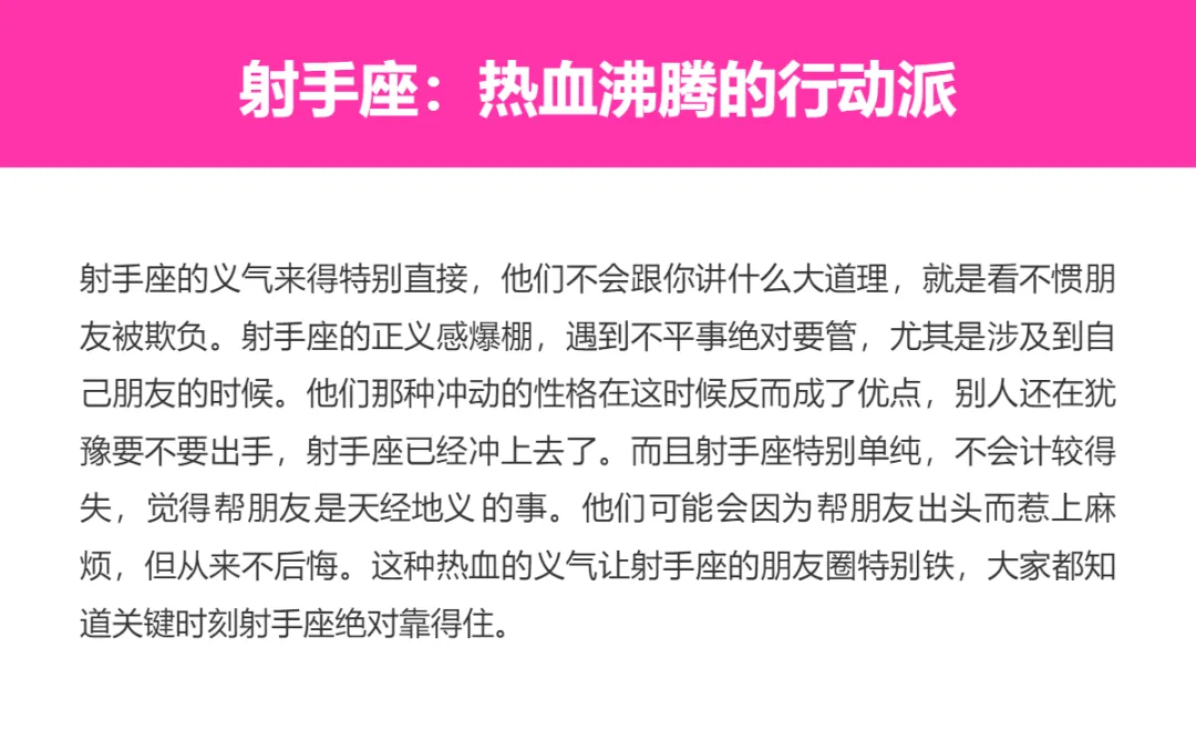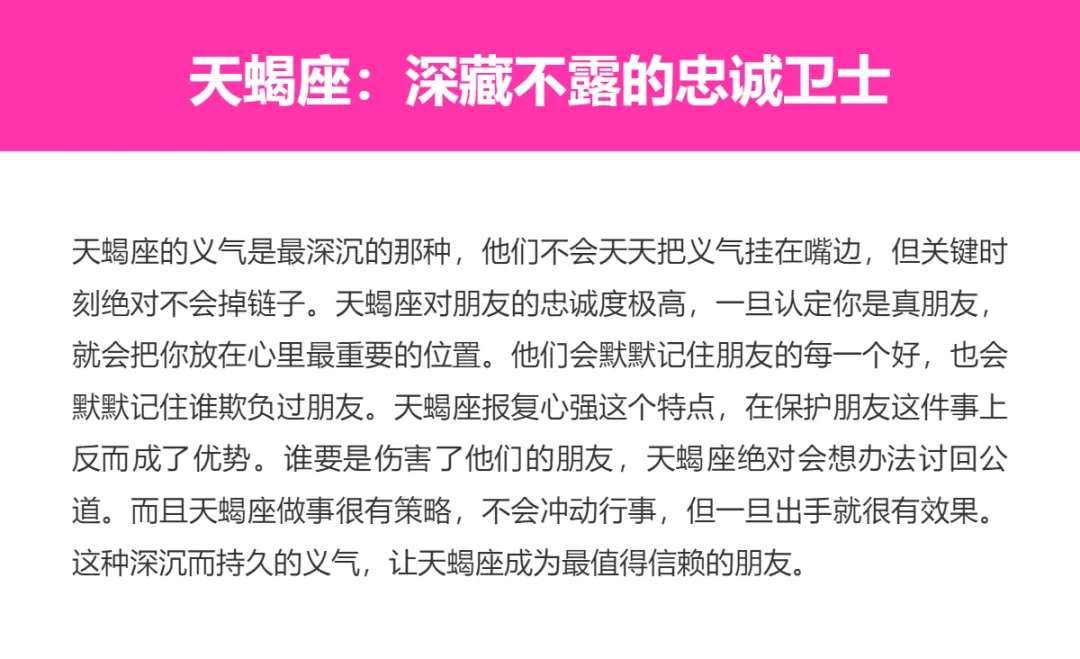 说到义气这个词,现在真的挺少见了。但你知道吗,有些人天生就是那种为了朋友能豁出去一切的性格。他们不是装的,也不是为了什么好处,就是骨子里带着那股劲儿。遇到朋友有事,二话不说就冲上去,哪怕自己吃亏也在所不惜。这种人在十二星座里还真不多,但有那么几个星座,义气值简直爆表。他们把朋友看得比什么都重要,真的是那种能为兄弟两肋插刀的主儿。今天就来聊聊这三个最讲义气的星座,看看你身边有没有这样的宝藏朋友。