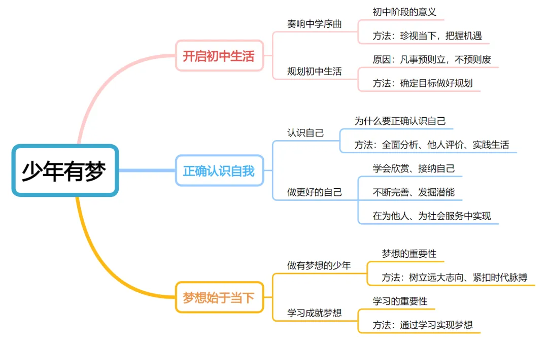 选择题 | 第一课:1. 初中生活的 “新” 表现:新身份、新机会、新要求;2. 中学时代的独特价值以及如何对待;3. 规划的重要性和如何规划。 第二课:1. 正确认识自我的意义;2. 认识自我的三大途径:全面分析自我、他人评价、生活实践;3. 正确对待他人评价;4. 接纳、欣赏、完善自我和发掘潜能的方法。 第三课:1. 梦想的内涵;2. 梦想的作用;3. 做有梦想的少年的要求;4. 学习的重要意义;5. 正确认识学习。 | 1. 覆盖核心基础:以考查基础知识为主,选项多为教材原文或简单变形,每课设置1-2题。 2. 情境贴合学情:以校园日常情境等出题(如社团选择、学习目标制定),易于理解。 |