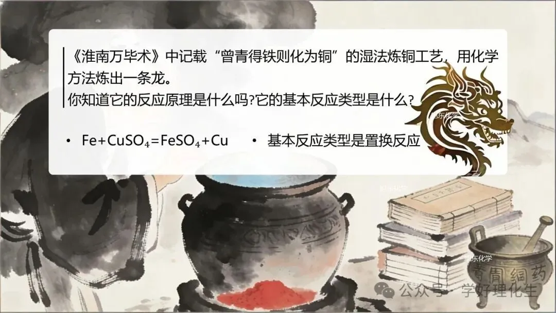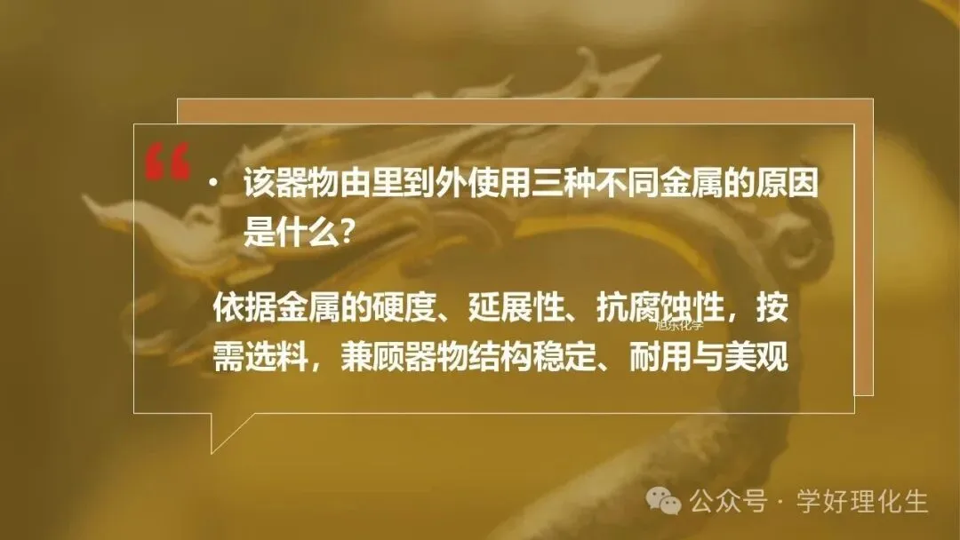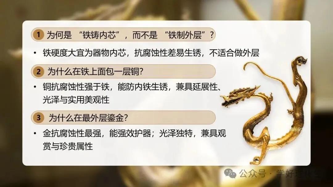 本课基于人教版第八单元 “金属及金属材料”,是单元专题复习课。以 “鎏金铁芯铜龙”为真实情境,通过 “赏龙、鉴龙、炼龙” 三大任务,整合金属材料分类、物理性质、化学性质、金属活动性顺序、金属冶炼与资源保护等核心知识,构建 “性质→用途→转化” 的知识网络,落实 “物质的性质与应用”主题要求。
