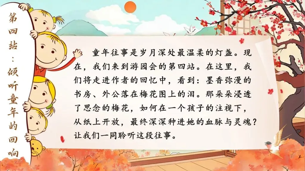 童年往事是岁月深处最温柔的灯盏。现在,我们来到游园会的第四站。在这里,我们将走进作者的回忆中,看到:墨香弥漫的书房、外公落在梅花图上的泪。那朵朵浸透了思念的梅花,如何在一个孩子的注视下,从纸上开放,最终深深种进她的血脉与灵魂?让我们一同聆听这段往事。