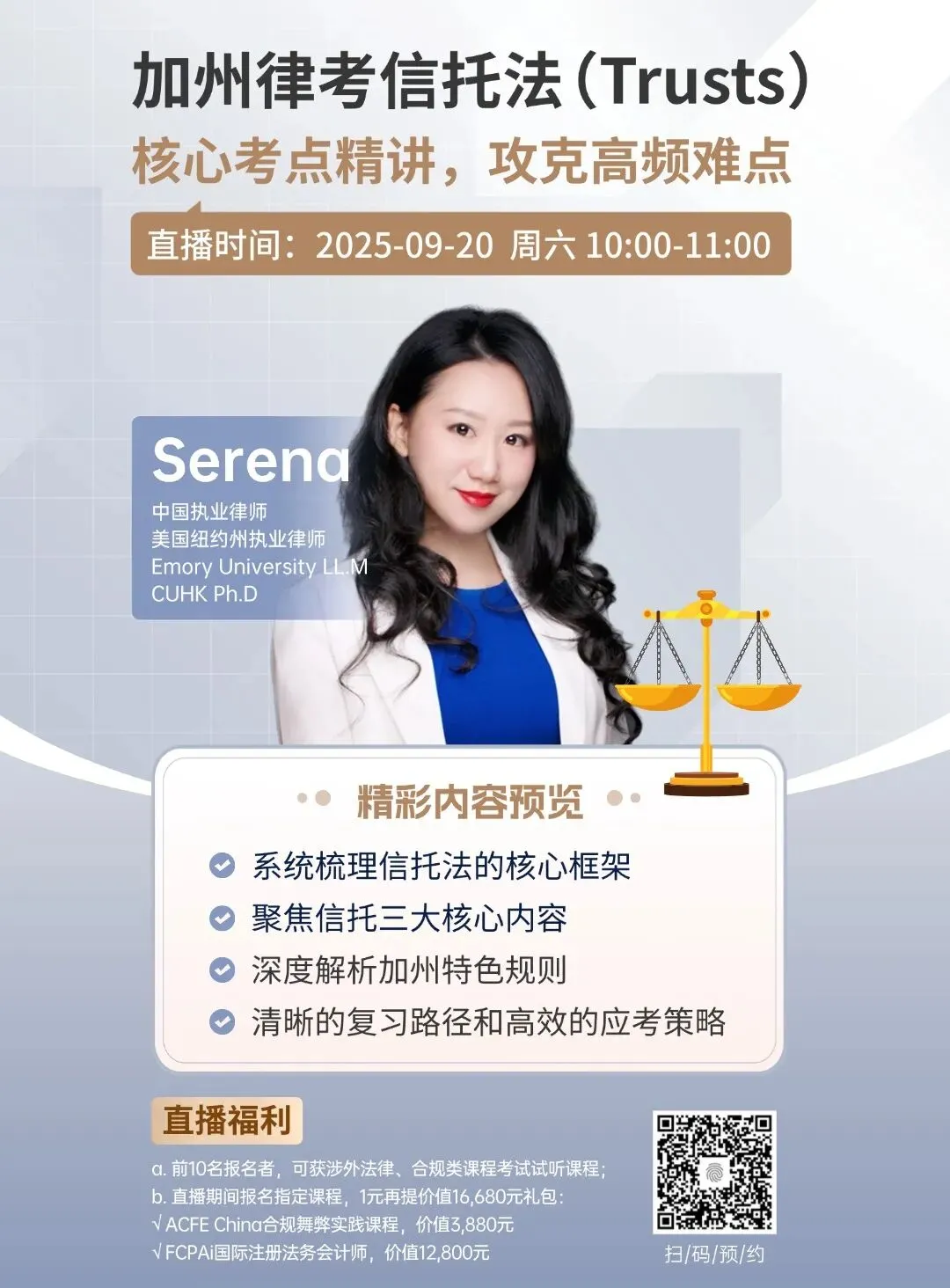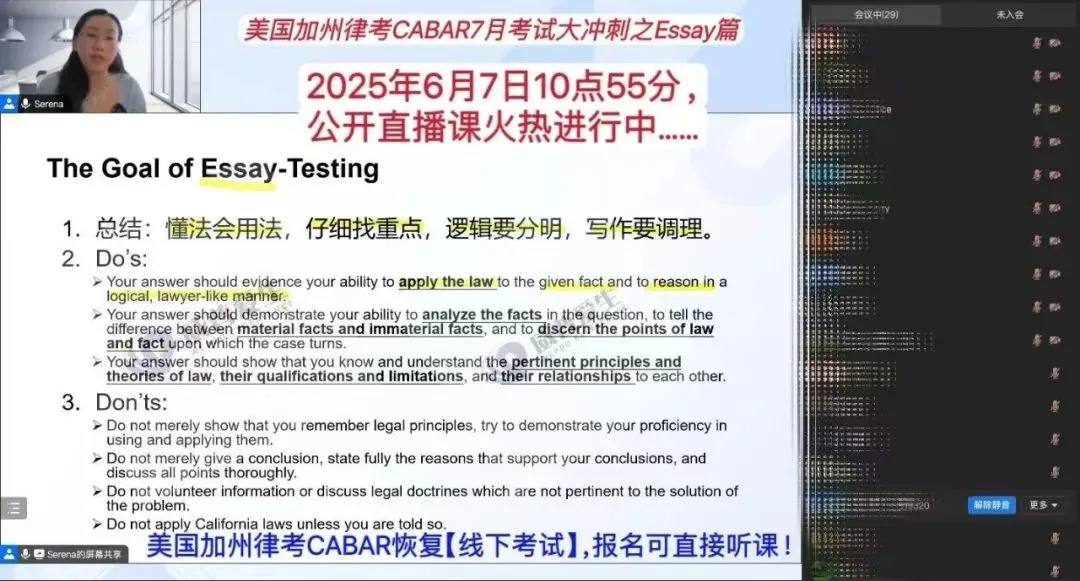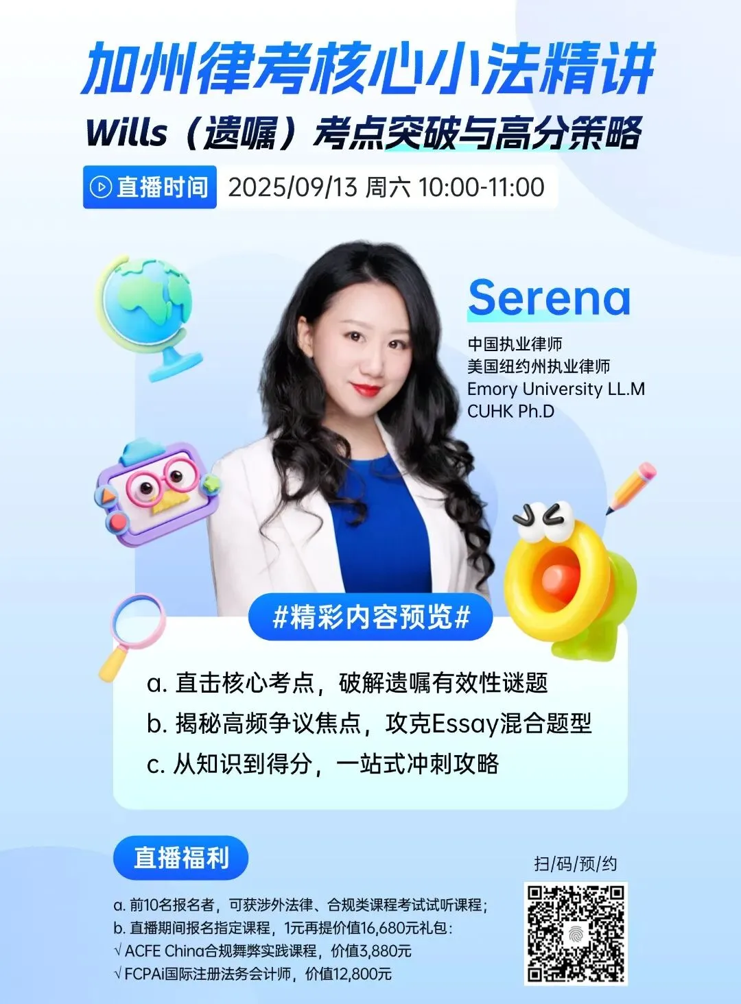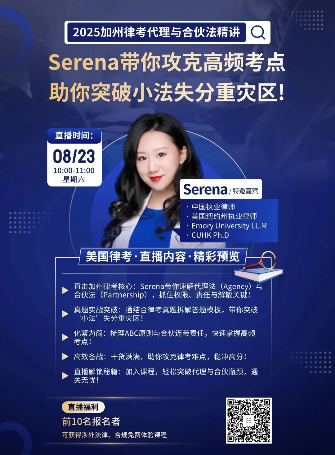 为了更好地应对2026年2月&7月美国加州律考CABAR,我们也上线了一系列直播课程(包含公开课及内部学员专属直播)目前Serena老师的USBAR美国律考系列直播持续更新中!