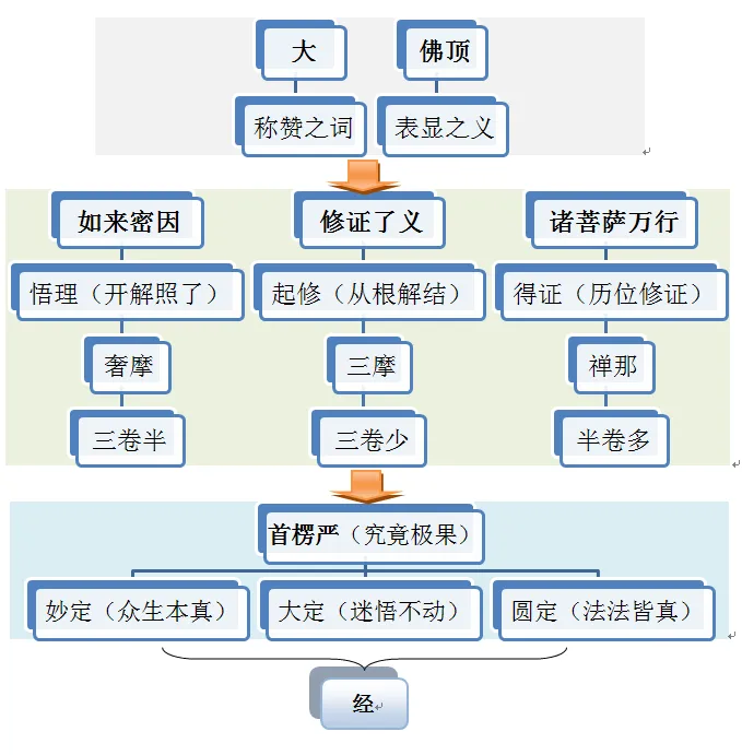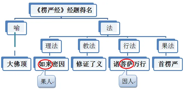 如来是果人,菩萨是因人,密因是理法,了义是教法,万行是行法,首楞严是果法:故以人、法为题,亦可略兼于喻。以佛顶二字,非举相似之物,比类发明,乃举直称法体之佛顶,以表胜妙,故曰略兼于喻。