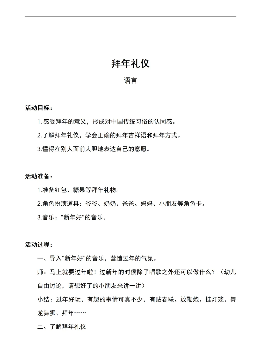 1.感受拜年的意义,形成对中国传统习俗的认同感。