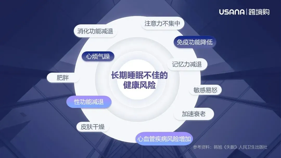 长期睡眠不佳的人,由于生理机能得不到休整养息,调节平衡功能受到损害,人体会产生如下问题: