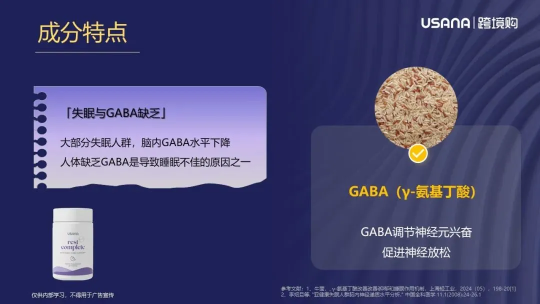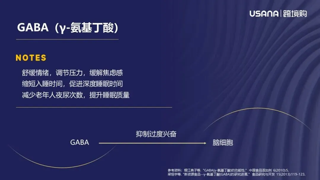 研究发现,睡眠状态下脑组织中的GABA含量较清醒时升高15%。据医学试验对各年龄段睡眠障碍患者的神经递质变化情况分析发现,各年龄段患者GABA实测值均低于或显著低于正常值。