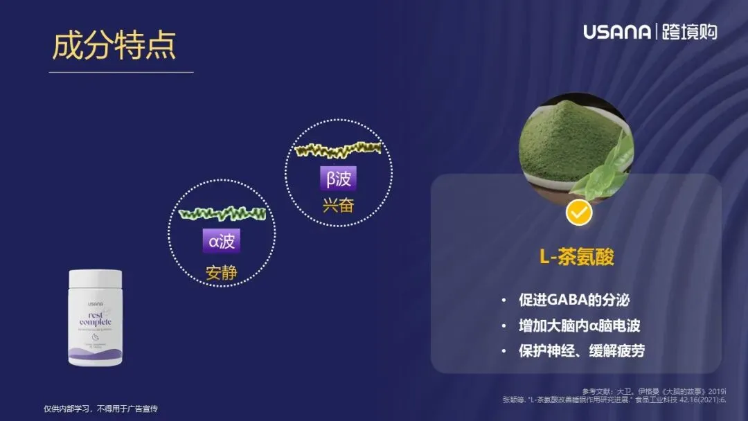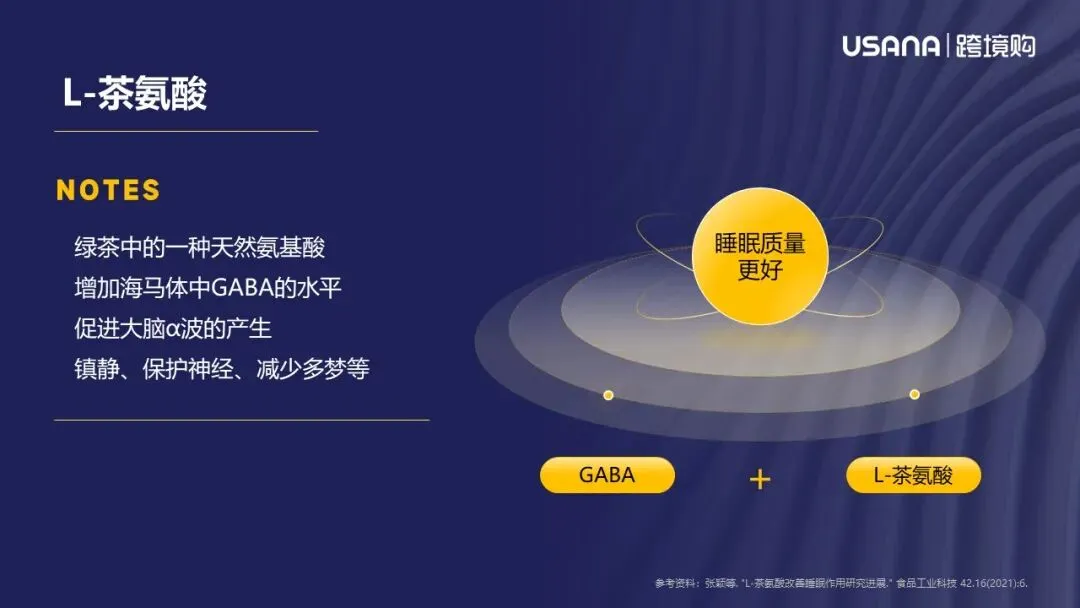 每片产品中添加了50mg的L-茶氨酸,茶氨酸是茶叶中的一种非蛋白氨基酸,具有保护神经、增强记忆、缓解疲 劳、抗肿瘤、降血压、降血脂等保健功能,茶氨酸还能促进人体自身GABA的分泌,并且能增加大脑中让人平静下来的α脑电波,保护神经,缓解疲劳,提高睡眠质量。