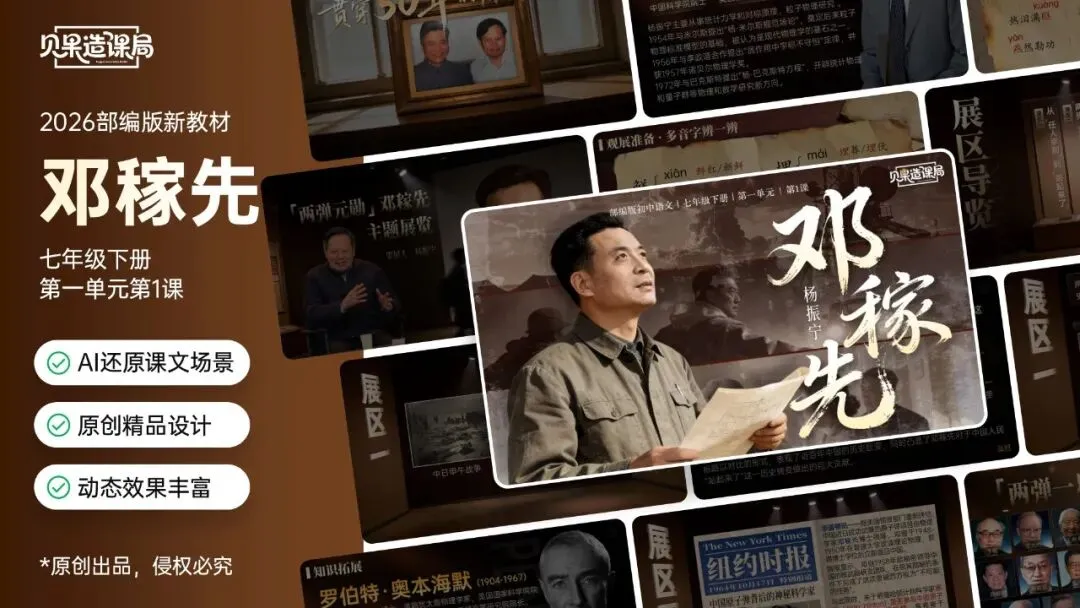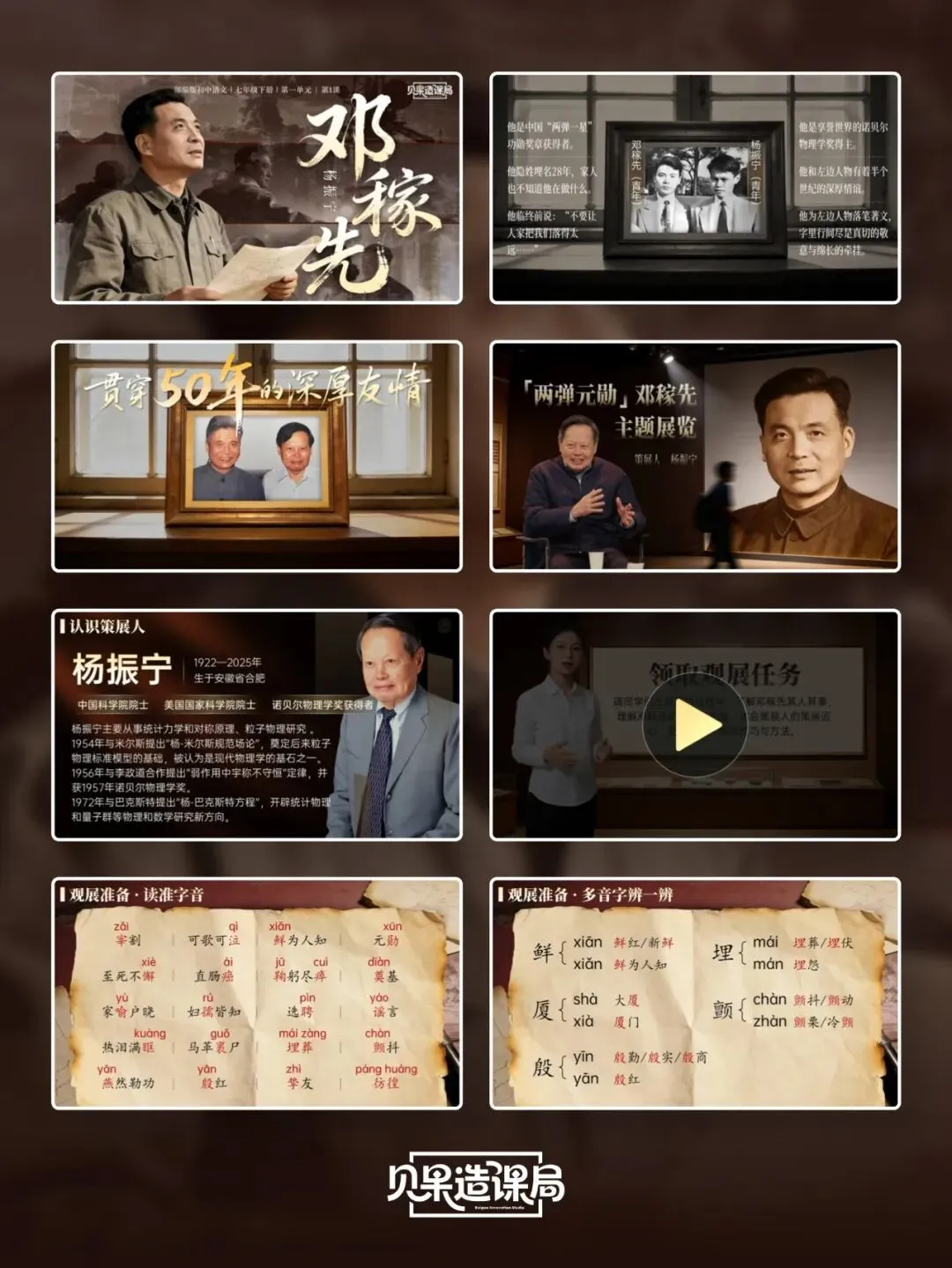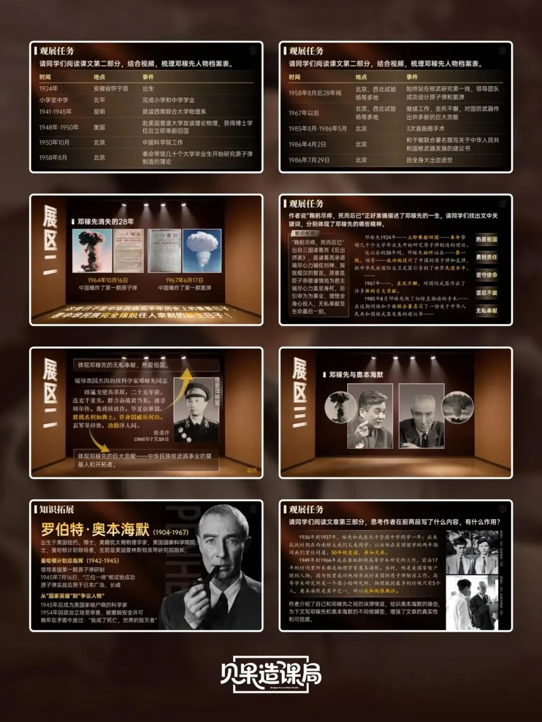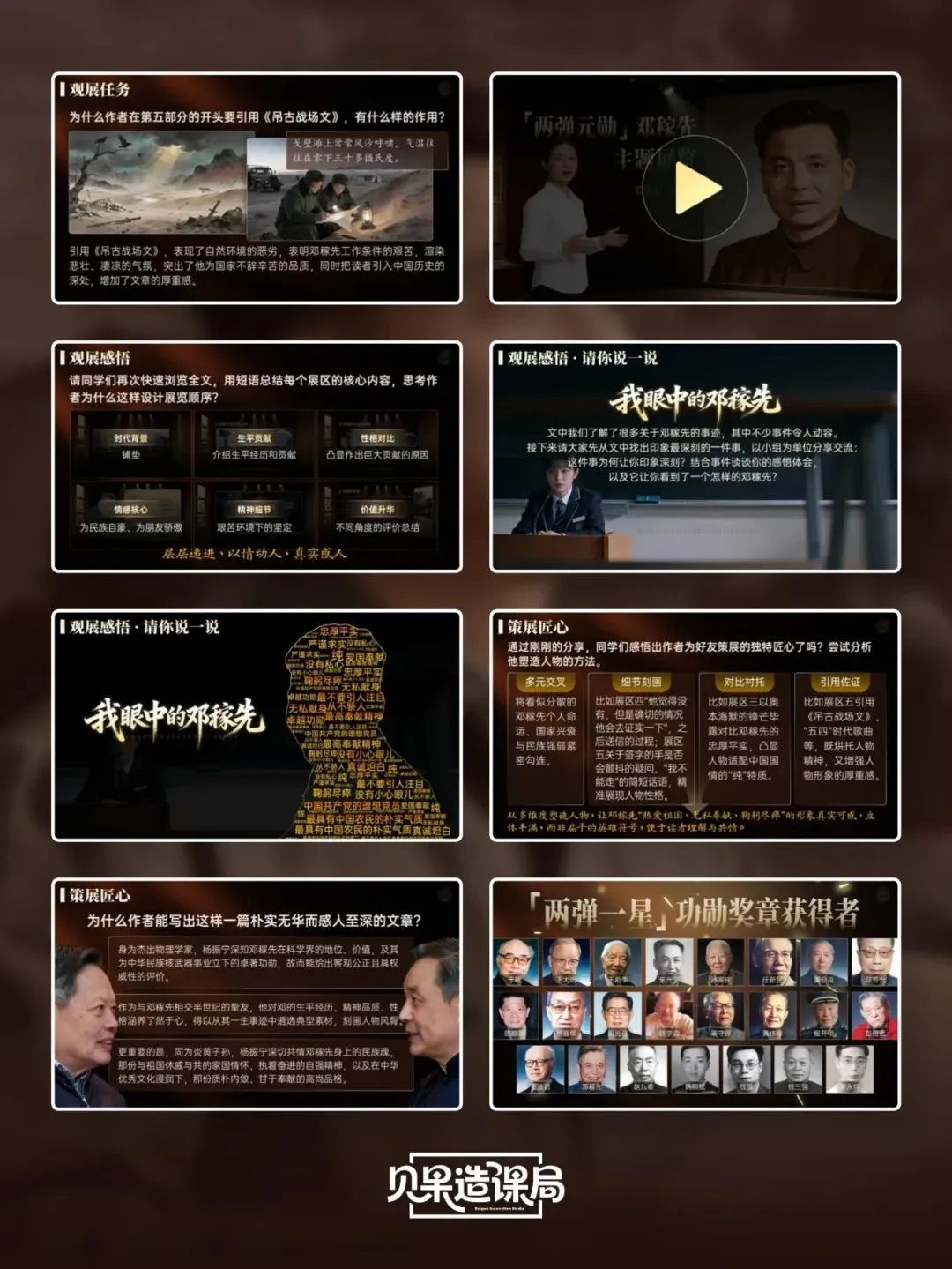 大家好~欢迎关注「贝果造课局」,今日分享部编版·七下语文第1课|杨振宁《邓稼先》精品课件。本课情境设计:观看由杨振宁“策展”的“‘两弹元勋’邓稼先主题展”,六大展区对应课文的6个部分,每个部分结合课文内容设计不同的展览材料,如历史图片、生平视频、模拟报纸、音频等,让学生可以沉静式观展,感受人物故事、体悟人物精神,同时理解作者的“策展匠心”。(购买方式在文章末尾)课件如有使用问题,均可联系客服,协助您第一时间解决:bgyw999