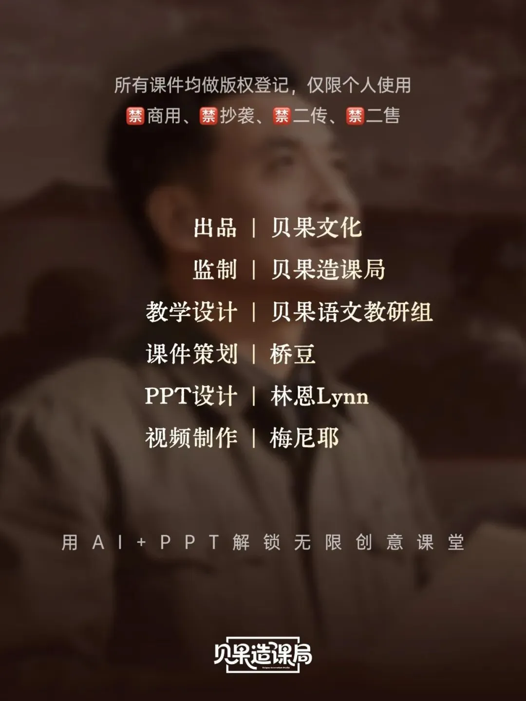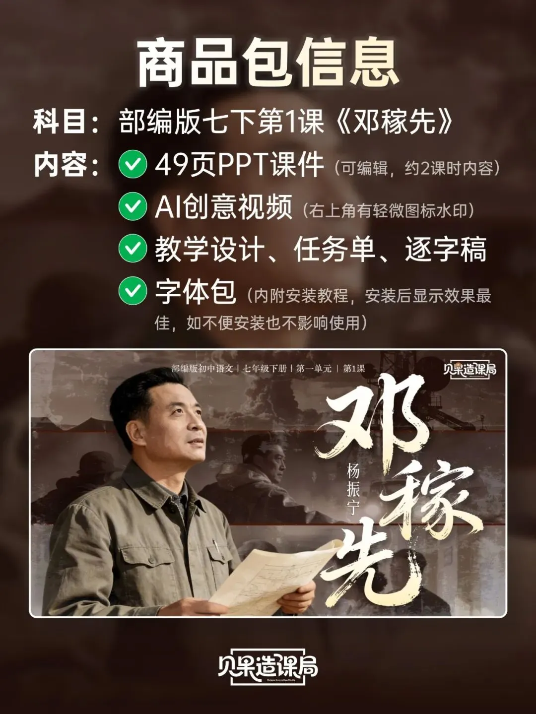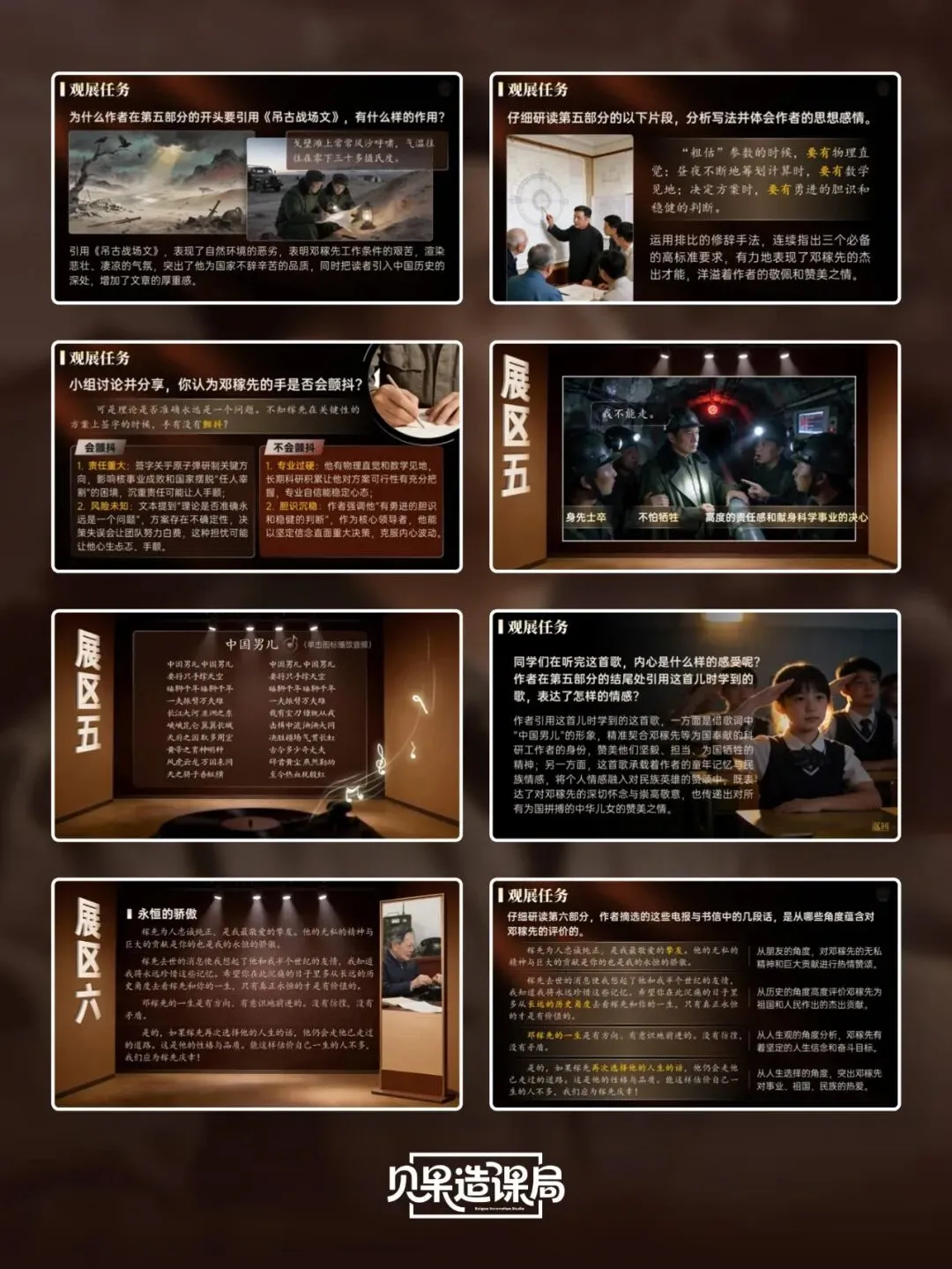 大家好~欢迎关注「贝果造课局」,今日分享部编版·七下语文第1课|杨振宁《邓稼先》精品课件。本课情境设计:观看由杨振宁“策展”的“‘两弹元勋’邓稼先主题展”,六大展区对应课文的6个部分,每个部分结合课文内容设计不同的展览材料,如历史图片、生平视频、模拟报纸、音频等,让学生可以沉静式观展,感受人物故事、体悟人物精神,同时理解作者的“策展匠心”。(购买方式在文章末尾)课件如有使用问题,均可联系客服,协助您第一时间解决:bgyw999