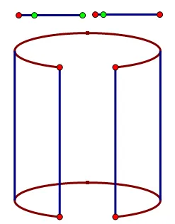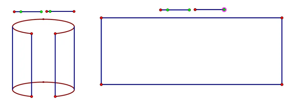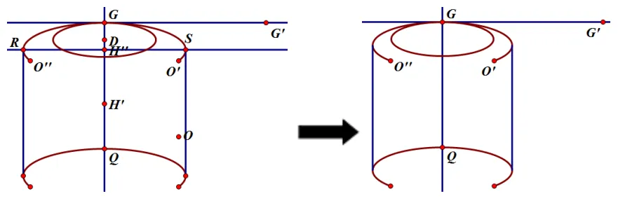 构造圆柱的高GQ,依次选中点G、点Q,点击【变换】→【标记向量】,选中点O",点击【变换】→【平移】,得到点O''',构造线段O''O'''。同上步骤平移点O'并构造线段。