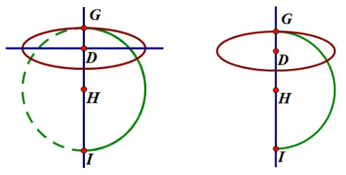 选中点G和线段AB,点击【构造】→【以圆心和半径绘圆】,取圆和直线GD的交点H,隐藏圆。依次选中点H和点G,点击【构造】→【以圆心和圆周上的点绘圆】,构造圆和直线GD的交点I。依次选中点H、点I和点G,点击【构造】→【圆上的弧】,隐藏不必要的对象。如图2-9-3。
