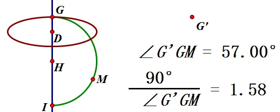 双击点G,选中点H,点击【变换】→【缩放】,点击公式“90°÷∠G'GM”,得到缩放后的点H'。依次选中点H'和点G,点击【构造】→【以圆心和圆周上的点绘制圆】。