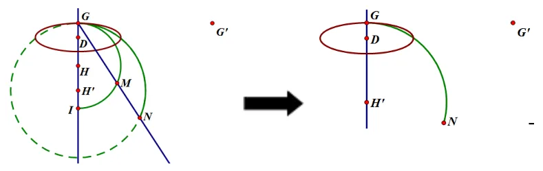 选中点G和点M构造射线,交圆于点N。依次选中点H'、点N、点G,构造圆上的弧,隐藏不必要的对象。如图2-9-5。