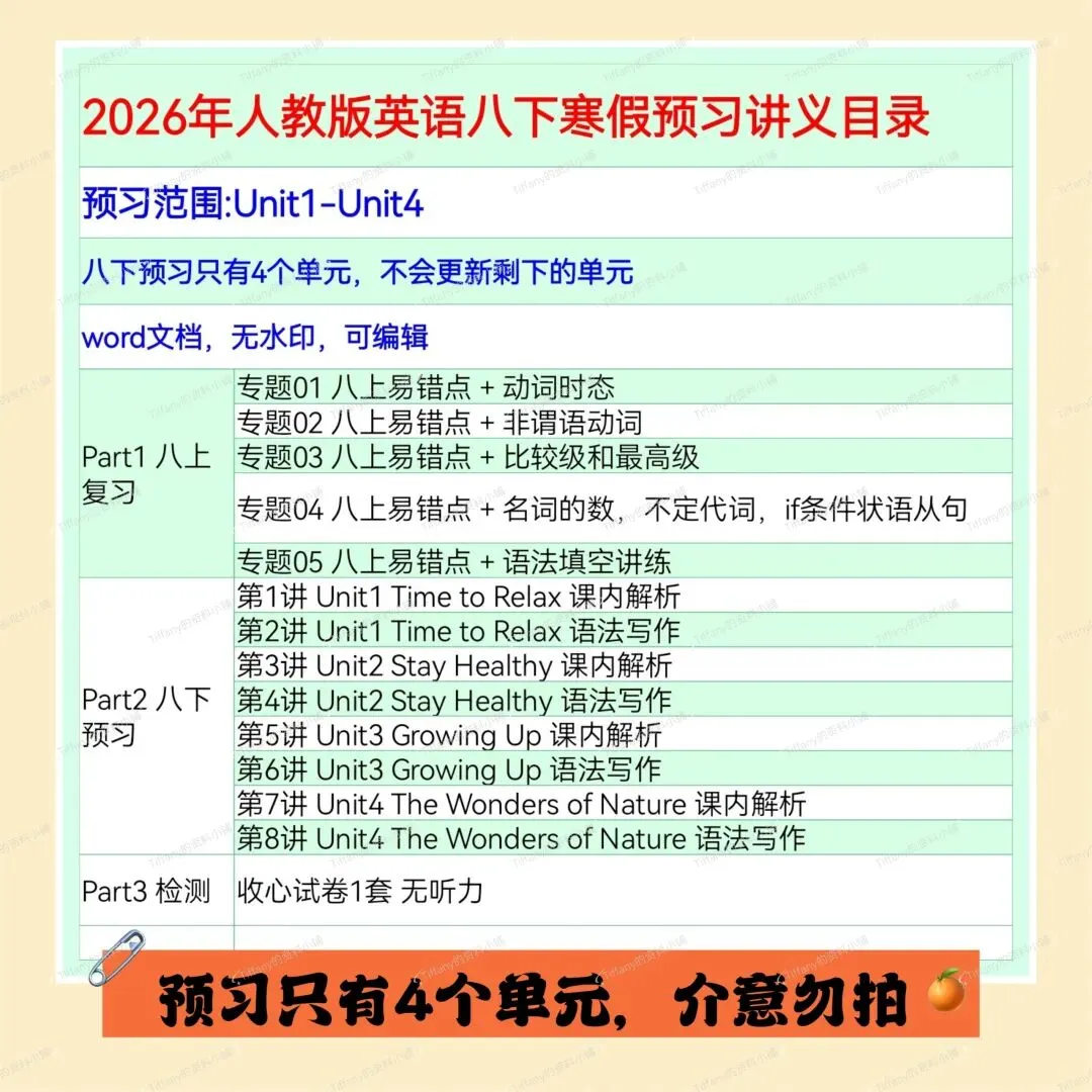 寒假预习讲义 | 26春人教八下英语Unit 1-Unit 4 (附下载链接)