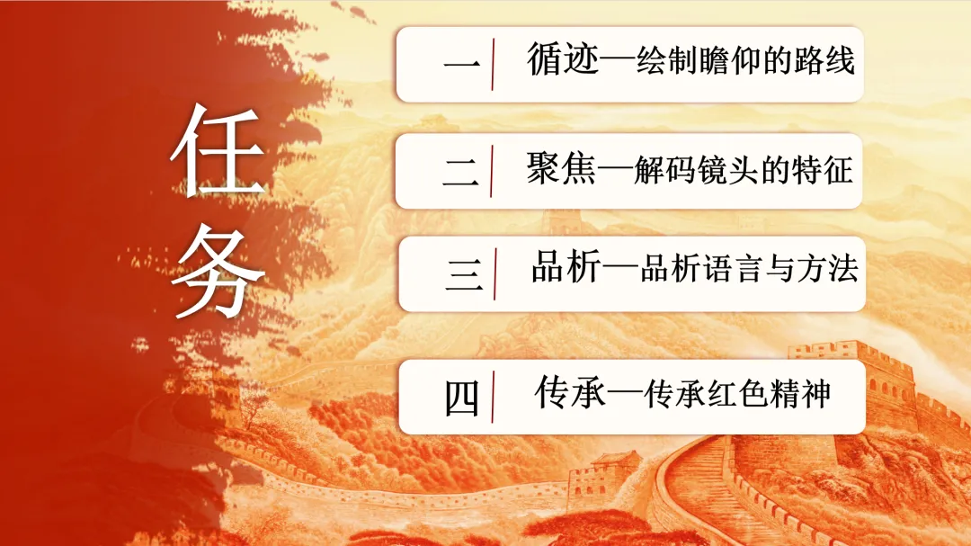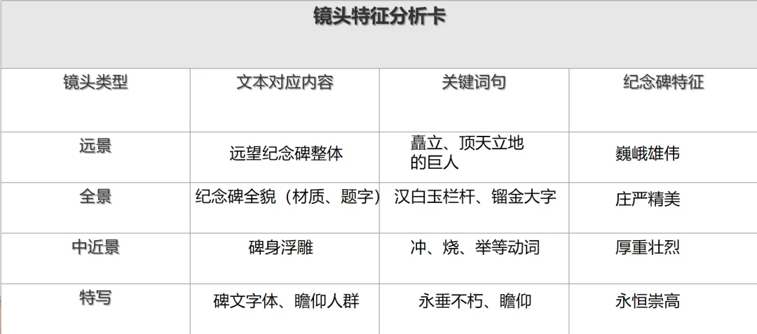 1. 任务发布:“拍摄路线确定后,我们需要为每个镜头提炼核心特征。请各小组以‘镜头导演’的身份,选择远景、全景、中近景、特写中的一组,合作完成‘镜头特征分析卡’。”
