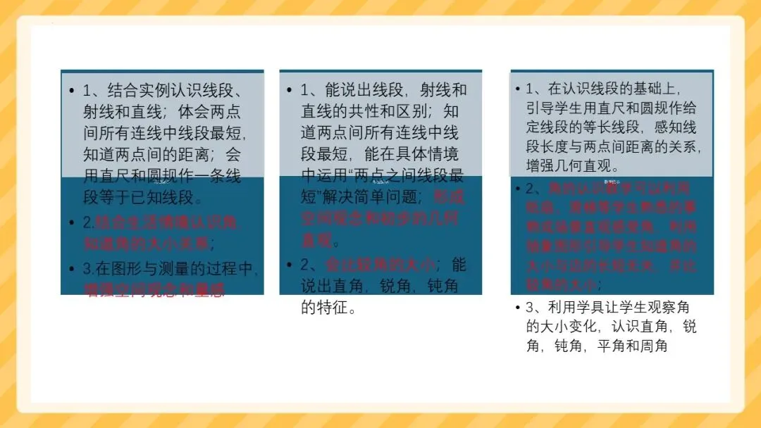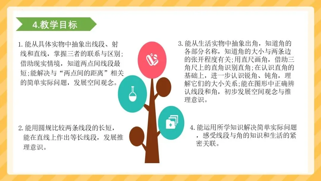 1. 知识与技能目标:能从具体实物中抽象出线段、射线和直线,掌握三者的联系与区别;借助现实情境,知道两点间线段最短,能解决与“两点间的距离”相关的简单实际问题。能用圆规比较两条线段的长短,能在直线上作出等长线段。能从生活实物中抽象出角,知道角的各部分名称,知道角的大小与两条边的张开程度有关;用直尺画角,借助三角尺上的直角识别直角,在认识直角的基础上,进一步认识锐角、钝角,理解它们的大小关系;能在图形中正确辨认线段和角。