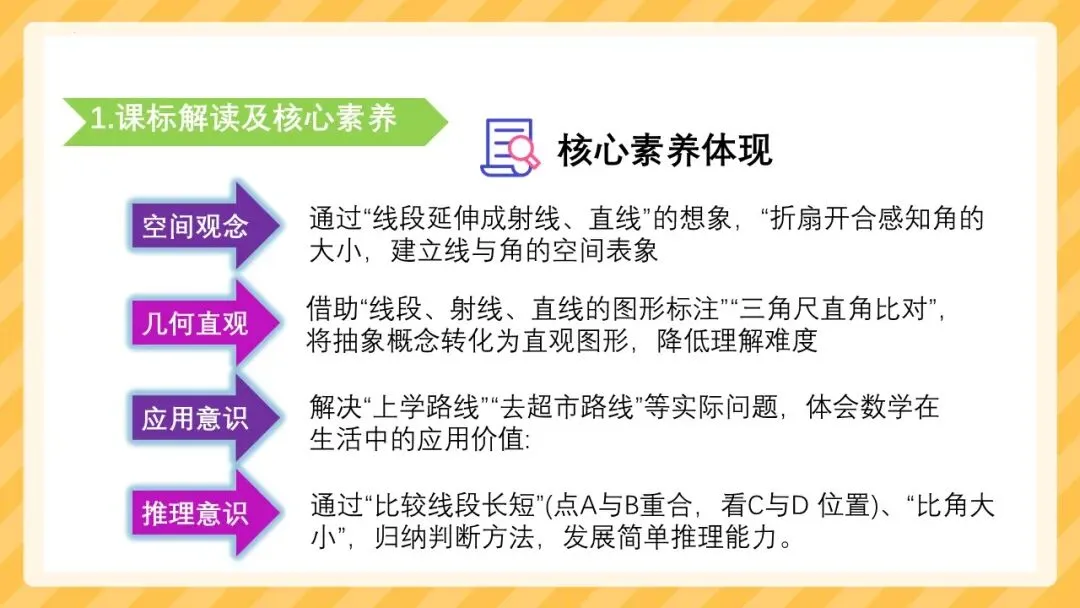 基于这样的课标要求,本单元的核心素养培养主要体现在四个方面。一是空间观念,通过“线段延伸成射线、直线”的想象,以及“折扇开合感知角的大小”等活动,帮助学生建立线与角的空间表象;二是几何直观,借助“线段、射线、直线的图形标注”“三角尺直角比对”等方式,将抽象的数学概念转化为直观可见的图形,有效降低学生的理解难度;三是应用意识,通过解决“上学路线”“去超市路线”等实际问题,让学生深刻体会数学在生活中的应用价值;四是推理意识,在“比较线段长短”(如点A与B重合,看C与D位置)、“比角大小”等活动中,引导学生归纳判断方法,发展简单的推理能力。可以说,课标是我们教学的“指南针”,而核心素养则是我们教学的“落脚点”,贯穿于整个单元的教学全过程。