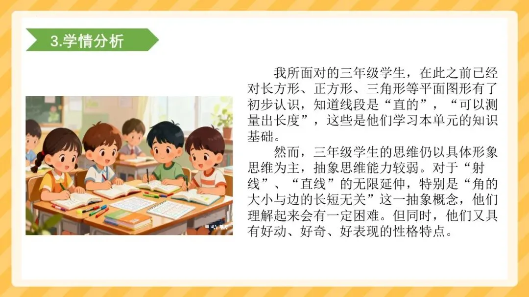 但从学生的思维特点来看,三年级学生仍以具体形象思维为主,抽象思维能力相对较弱。对于“射线”“直线”的无限延伸这一抽象特征,尤其是“角的大小与边的长短无关”这一核心知识点,他们理解起来会有一定的困难。不过,值得一提的是,三年级学生具有好动、好奇、好表现的性格特征,对新鲜事物充满探索欲望,这也为我们开展多样化的教学活动提供了有利条件。