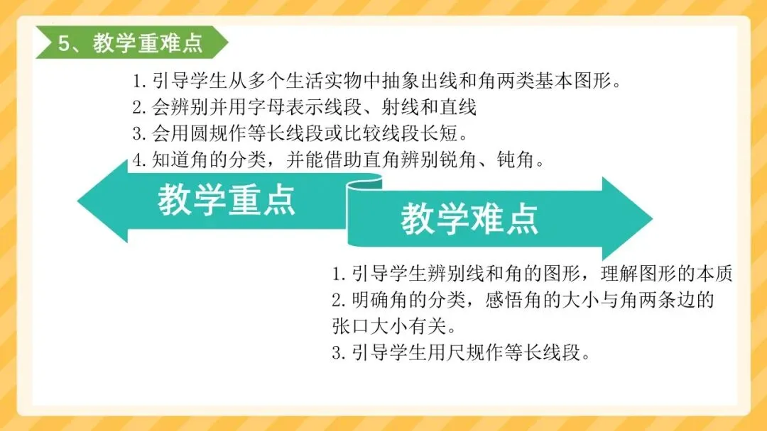 教学重点主要有四个方面:一是引导学生从多个生活实物中抽象出线和角两类基本图形;二是会辨别并用字母表示线段、射线和直线;三是会用圆规作等长线段或比较线段长短;四是知道角的分类,并能借助直角辨别锐角、钝角。这些重点内容是学生后续学习几何知识的基础,必须让学生扎实掌握。