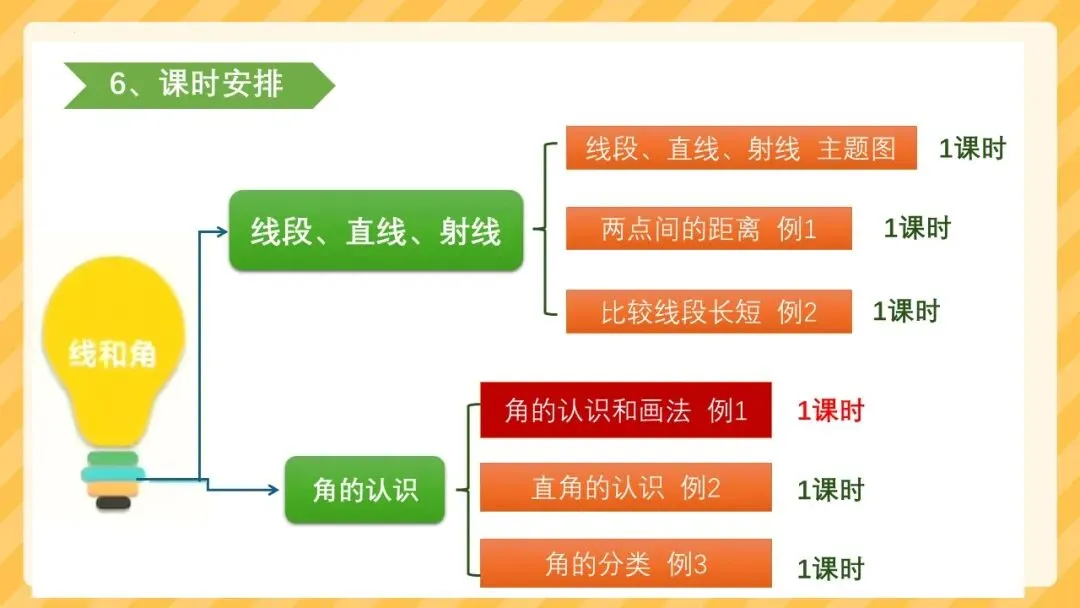 4. 第4课时:角的认识和画法(例1),帮助学生认识角的定义、各部分名称,掌握角的画法。