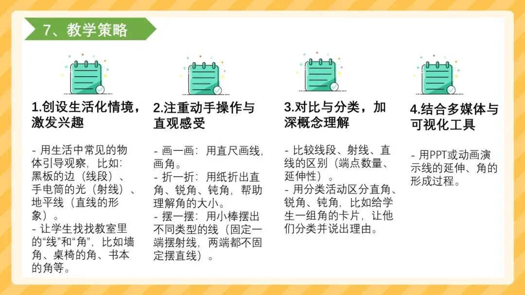 4. 结合多媒体与可视化工具。现代信息技术为教学提供了有力的支持。教学中,我会用PPT或动画演示线的延伸、角的形成过程,让学生更直观地感受图形的特征和变化;还会利用三角尺、量角器、圆规等可视化工具,辅助学生进行操作和探究,让教学过程更生动、更高效。