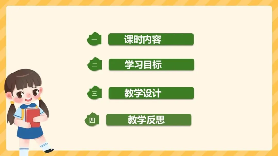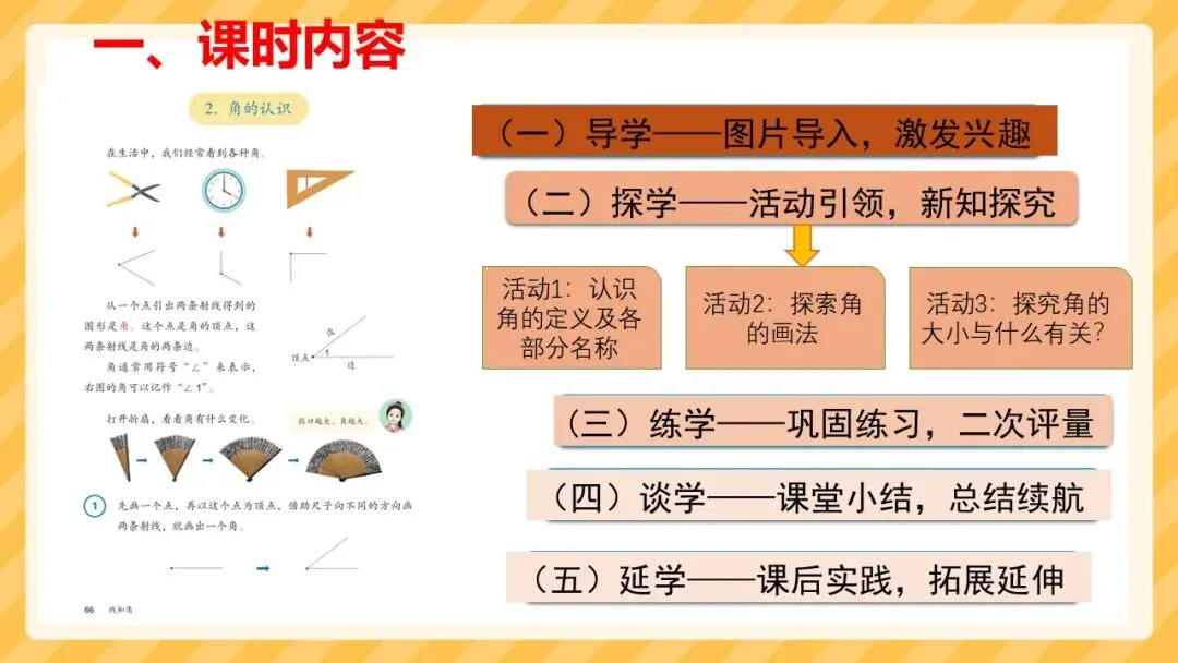 接下来,我将以“角的认识和画法”这一课时为例,进行具体的课时说课,从课时内容、学习目标、教学设计、教学反思四个方面展开说明。