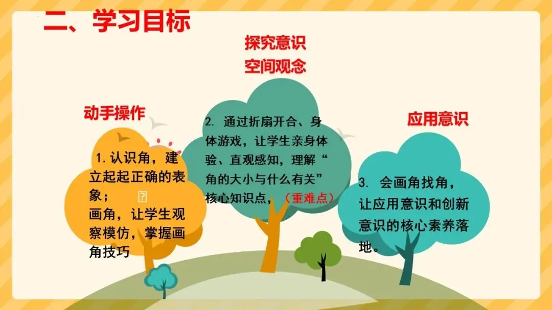 3. 情感态度与价值观:会找角、画角,感受角与生活的联系,让应用意识和创新意识的核心素养落地,激发对数学学习的兴趣。