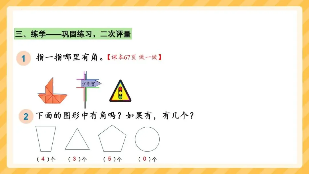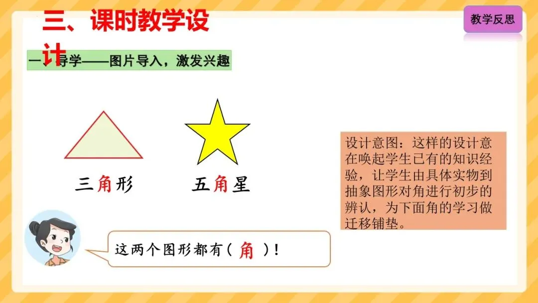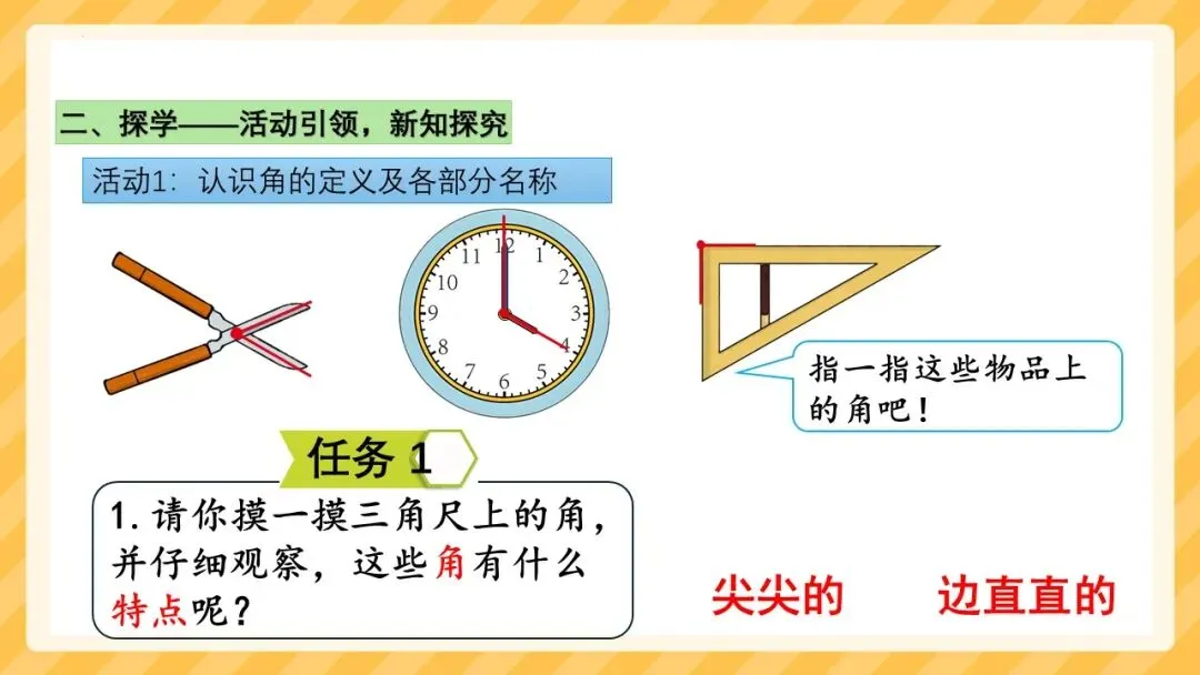 1. 导学——图片导入,激发兴趣。上课伊始,我会出示三角形和五角星的图片,提问:“同学们,这两个我们熟悉的图形都有什么共同的特征呢?”引导学生发现它们都有角,从而唤起学生已有的知识经验,让学生由具体实物到抽象图形对角进行初步的辨认,为下面角的学习做迁移铺垫。接着,我会让学生指一指身边物品上的角,比如三角尺、课本、时钟等,进一步激发学生的学习兴趣,自然地导入新课。