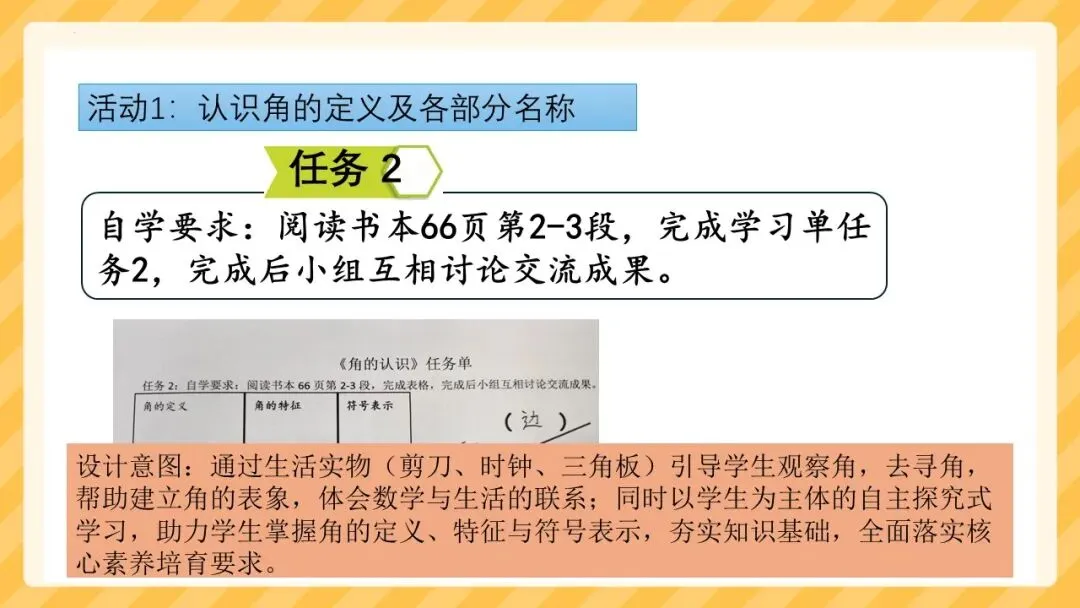 - 活动1:认识角的定义及各部分名称。首先,我会让学生摸一摸三角尺上的角,感受角的特点——尖尖的顶点和直直的边。然后,提出自学要求:阅读书本66页第2-3段,完成学习单任务2,填写角的定义、特征和符号表示,完成后小组互相讨论交流成果。通过生活实物引导学生观察角、寻找角,帮助建立角的表象,体会数学与生活的联系;同时以学生为主体的自主探究式学习,助力学生掌握角的定义、特征与符号表示,夯实知识基础。之后,我会出示一些图形,让学生判断哪些是角、哪些不是角,在辨析中及时巩固角的特点,建立起正确的表象。