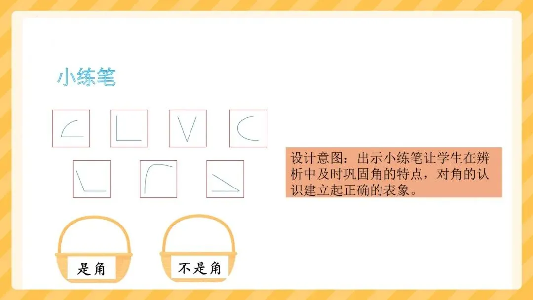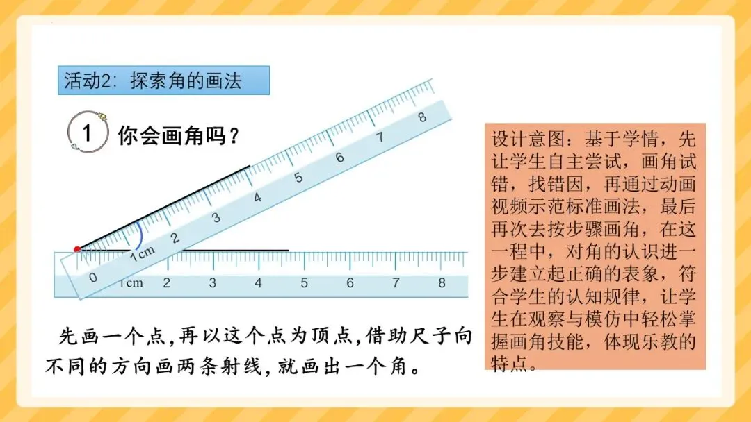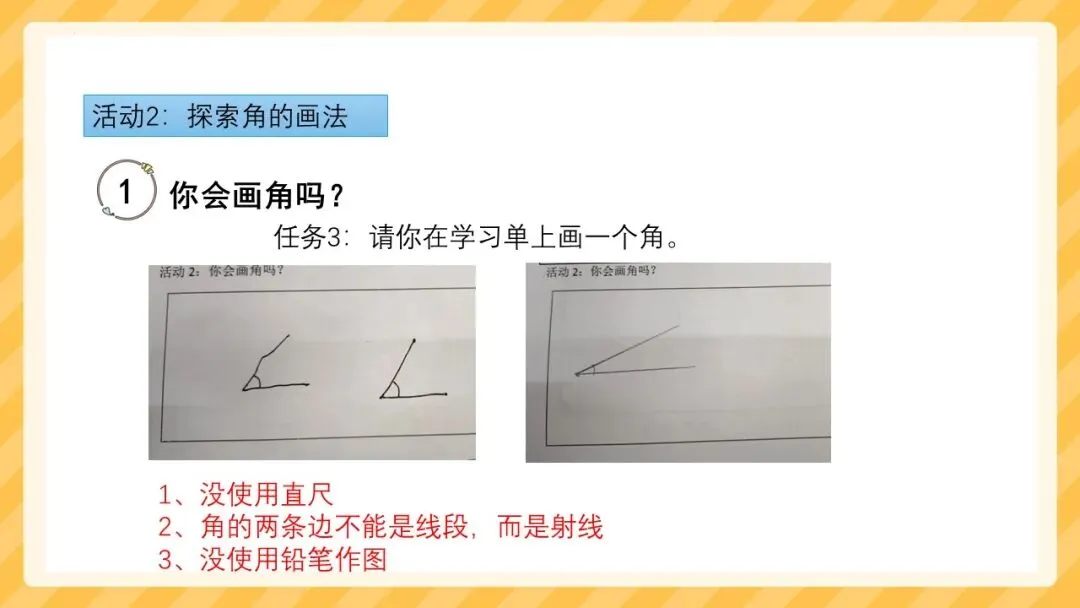 - 活动2:探索角的画法。我会先提问:“同学们,认识了角之后,你们会画角吗?”然后让学生在学习单上自主尝试画一个角。在学生尝试后,我会收集学生画角过程中出现的问题,比如没使用直尺、角的两条边画成了线段、没使用铅笔作图等,针对性地进行讲解。接着,通过动画视频示范标准画法:先画一个点,再以这个点为顶点,借助尺子向不同的方向画两条射线,就画出一个角。最后,让学生再次按照步骤画角,在观察与模仿中轻松掌握画角技能,符合学生的认知规律。