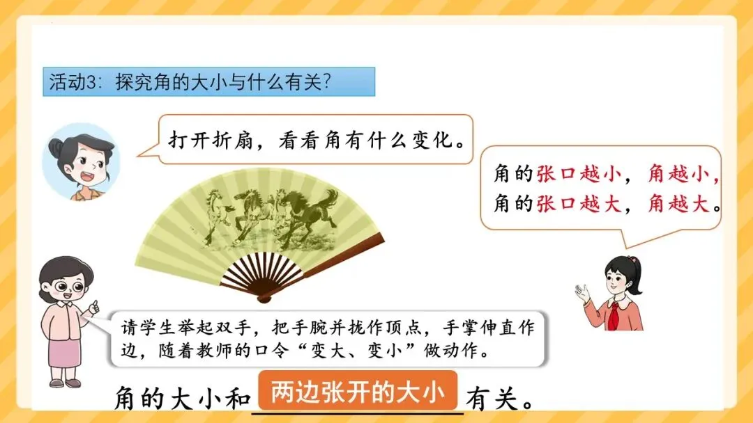 2. 过程与方法:通过折扇开合、身体游戏等活动,亲身体验、直观感知,理解“角的大小与两条边张开程度有关,与边的长短无关”这一核心知识点,发展空间观念和探究意识。