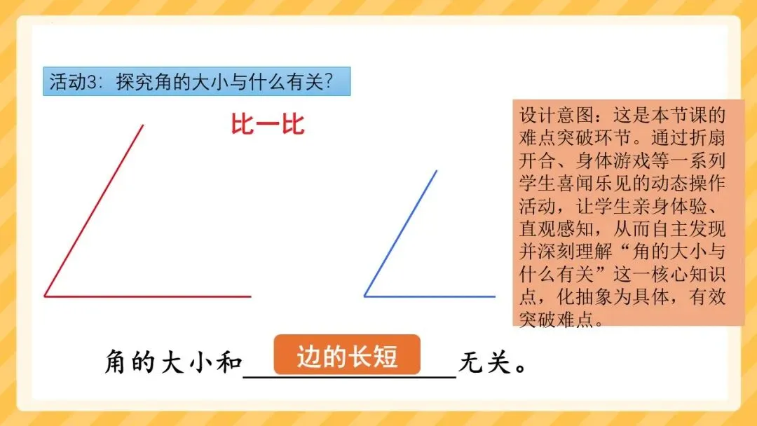 - 活动3:探究角的大小与什么有关。这是本节课的难点突破环节。首先,我会让学生打开折扇,观察角的变化,感受“角的张口越小,角越小;角的张口越大,角越大”。然后,组织学生开展身体游戏:举起双手,把手腕并拢作顶点,手掌伸直作边,随着教师的口令“变大、变小”做动作,进一步直观感受角的大小变化。之后,我会出示两个边的长短不同但张口大小相同的角,让学生比一比,发现它们的大小相等,从而得出“角的大小与边的长短无关”的结论。通过这一系列学生喜闻乐见的动态操作活动,化抽象为具体,有效突破难点。