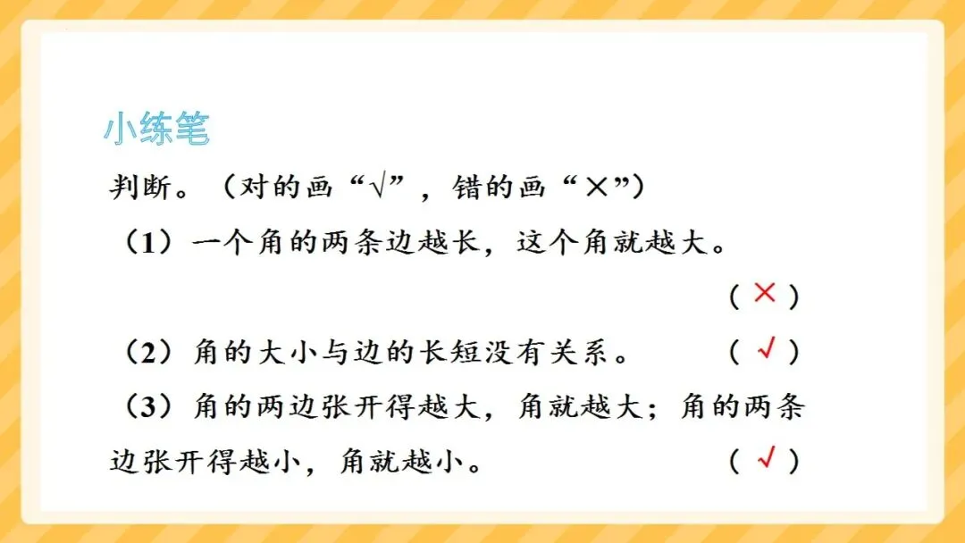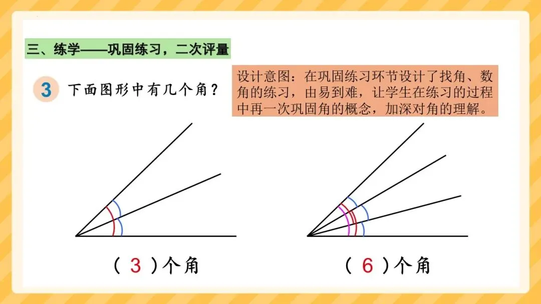 3. 练学——巩固练习,二次评量。为了巩固本节课所学知识,我设计了由易到难的练习题。一是判断对错,比如“一个角的两条边越长,这个角就越大”“角的大小与边的长短没有关系”等,强化学生对角度大小相关知识的理解;二是找角,让学生找出给定图形中的角并数出个数;三是拓展提升,让学生数出更复杂图形中的角的个数,在练习的过程中再一次巩固角的概念,加深对角的理解。