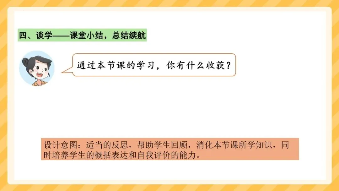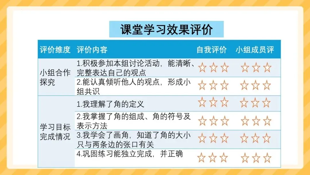 4. 谈学——课堂小结,总结续航。在课堂接近尾声时,我会提问:“通过本节课的学习,你有什么收获?”引导学生回顾本节课所学的知识,包括角的定义、各部分名称、画法以及角的大小与什么有关。适当的反思,帮助学生回顾、消化本节课所学知识,同时培养学生的概括表达和自我评价的能力。
