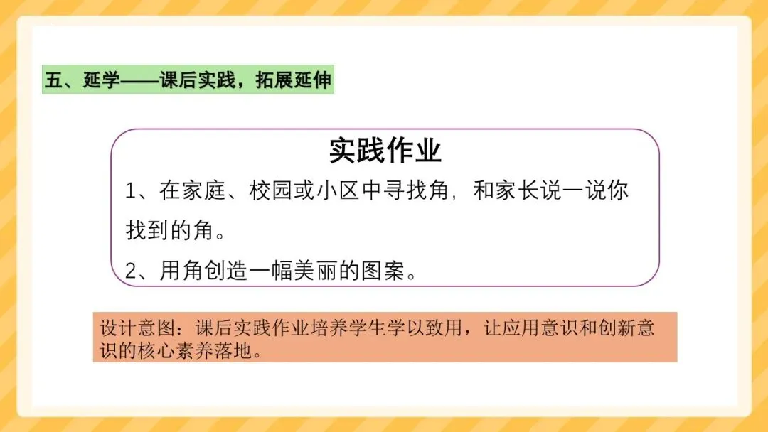 5. 延学——课后实践,拓展延伸。为了让学生将所学知识运用到生活中,我布置了两项实践作业:一是在家庭、校园或小区中寻找角,和家长说一说找到的角;二是用角创造一幅美丽的图案。这样的作业设计培养学生学以致用的能力,让应用意识和创新意识的核心素养落地。