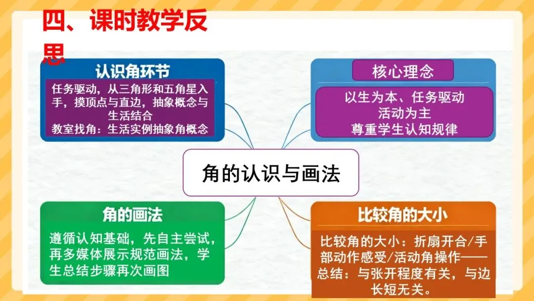 本节课的设计始终遵循“以生为本、任务驱动、活动为主、尊重学生认知规律”的核心理念。在认识角环节,通过小组活动导入,从三角形和五角星入手,让学生摸顶点与直边,再到教室找角,将抽象概念与生活紧密结合,充分调动了学生的积极性;在比较角的大小环节,借助折扇开合、手部动作感受、活动角操作等多种形式,让学生自主发现角的大小与张开程度有关,与边的长短无关,成功突破了教学难点;在角的画法教学中,尊重学生的认知基础,先让学生自主尝试,再用多媒体展示规范画法,最后让学生总结步骤再次画图,符合学生的认知规律。