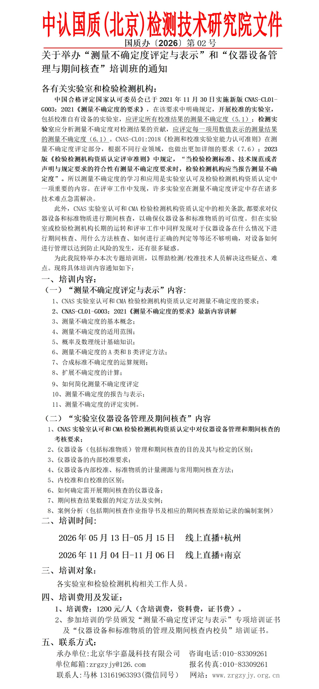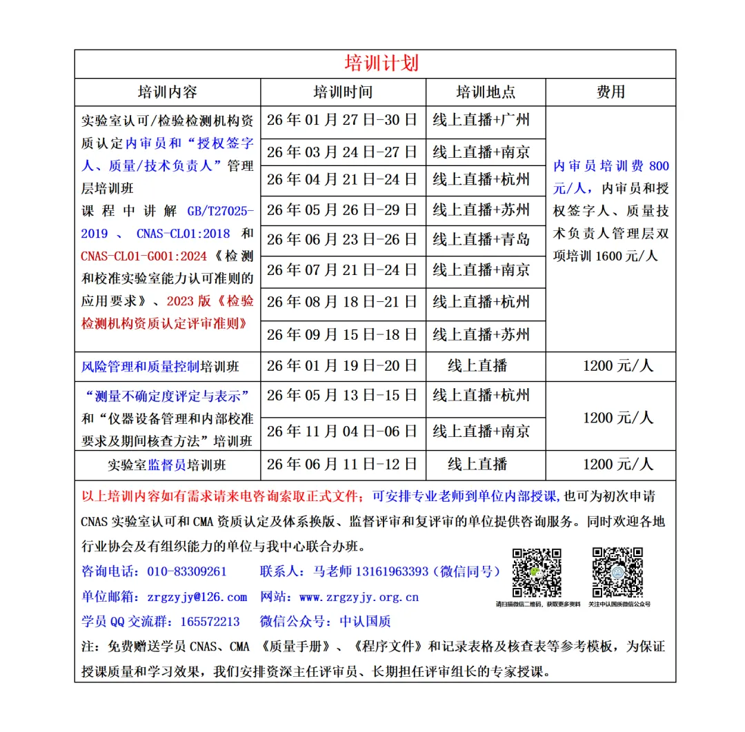 通知,我院2025年12月23日-26日(线上直播+南京)、2026年01月27日-30日(线上直播+广州)、2026年03月24日-27日(线上直播+南京)、2026年04月21日-24日(线上直播+杭州)、2026年05月26日-29日(线上直播+苏州)、2026年06月23日-26日(线上直播+青岛)举办“CNAS实验室认可内审员、CMA检验检测机构资质认定内审员 和 授权签字人、质量/技术负责人管理层”培训课程,课程中详细讲解GB/T27025-2019、CNAS-CL01:2018《检测和校准实验室能力认可准则》(等同采用ISO/IEC17025-2017)、新版CNAS-CL01-G001:2024《检测和校准实验室能力认可准则的应用要求》和2023版《检验检测机构资质认定评审准则》及释义相关内容。内审员和授权签字人两项内容培训费:1600元/人,内审员培训费:800元/人,赠送学员CNAS、CMA新版《质量手册》、《程序文件》和质量记录表格等体系文件参考模版。凡参加线上培训的学员,后续可享受免费参加线下培训,请各单位领导给予大力支持,积极安排相关工作人员报名参加。同时也请大家帮忙转发。