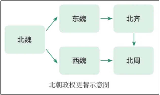 三、北朝:十六国后期,鲜卑拓跋氏建立的北魏,逐渐统一北方。后来,北魏设立了六个军镇,后来发生六镇兵变,北魏分裂为东魏、西魏。后来,北齐取代东魏,北周取代西魏,最后北周又灭掉北齐。这些王朝总称为“北朝”。
