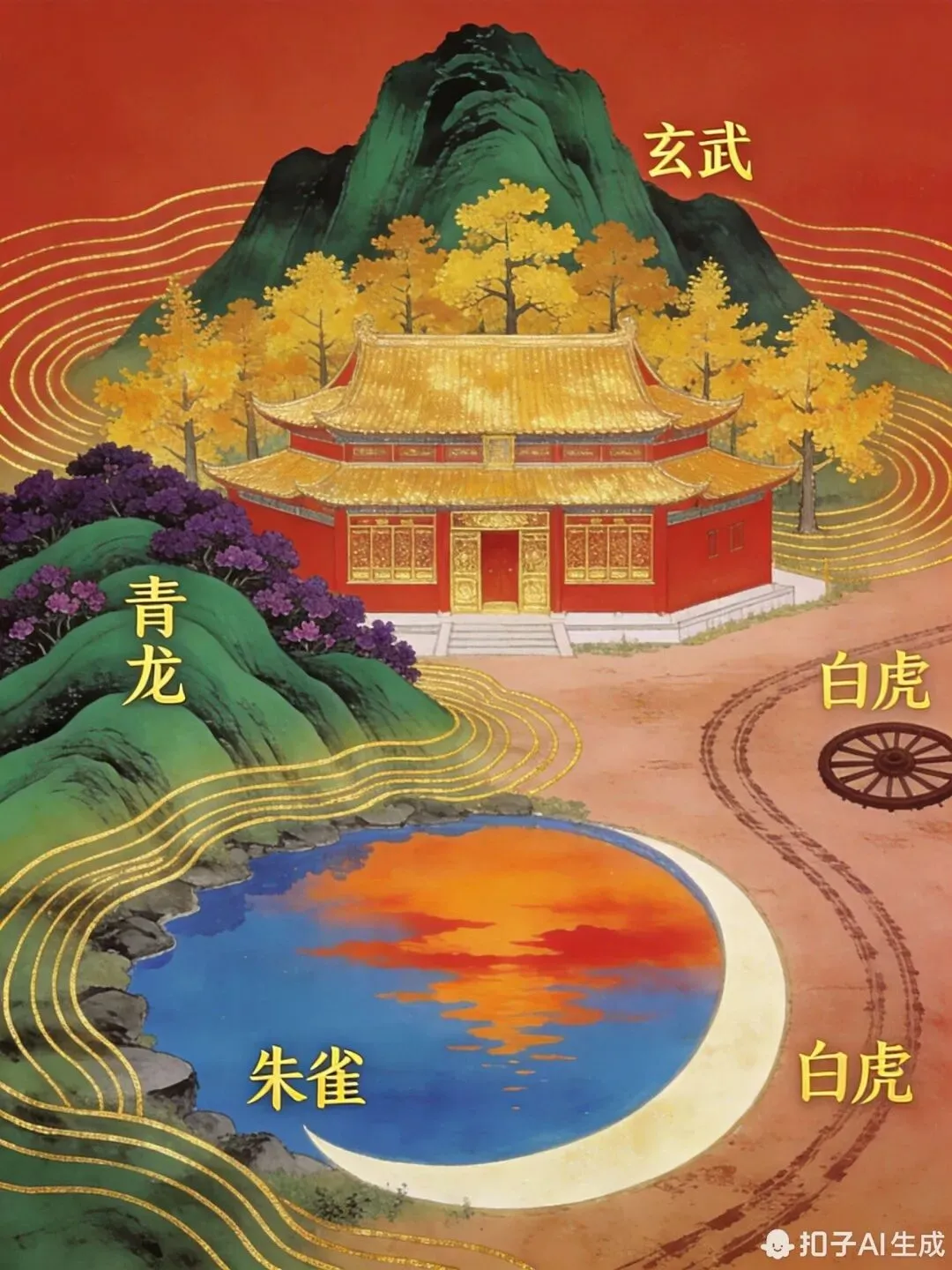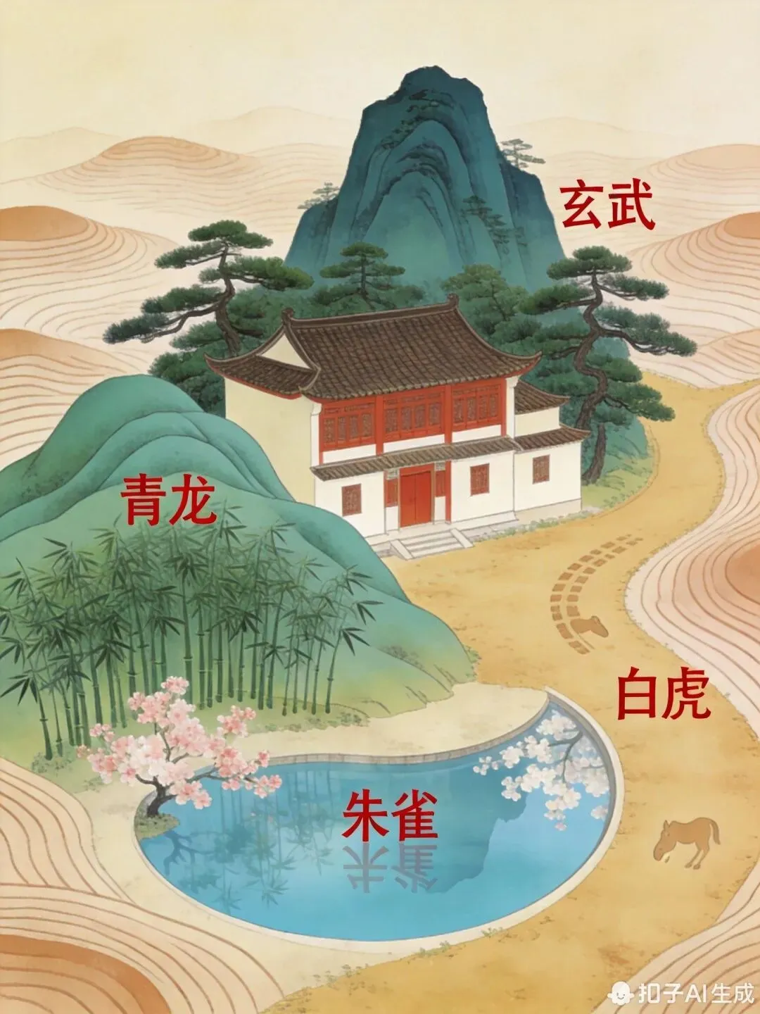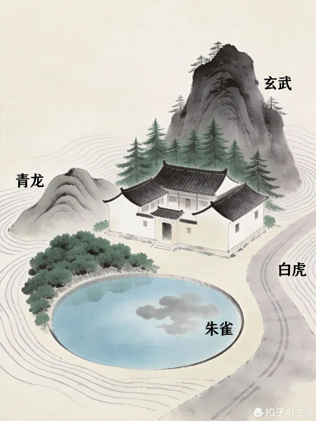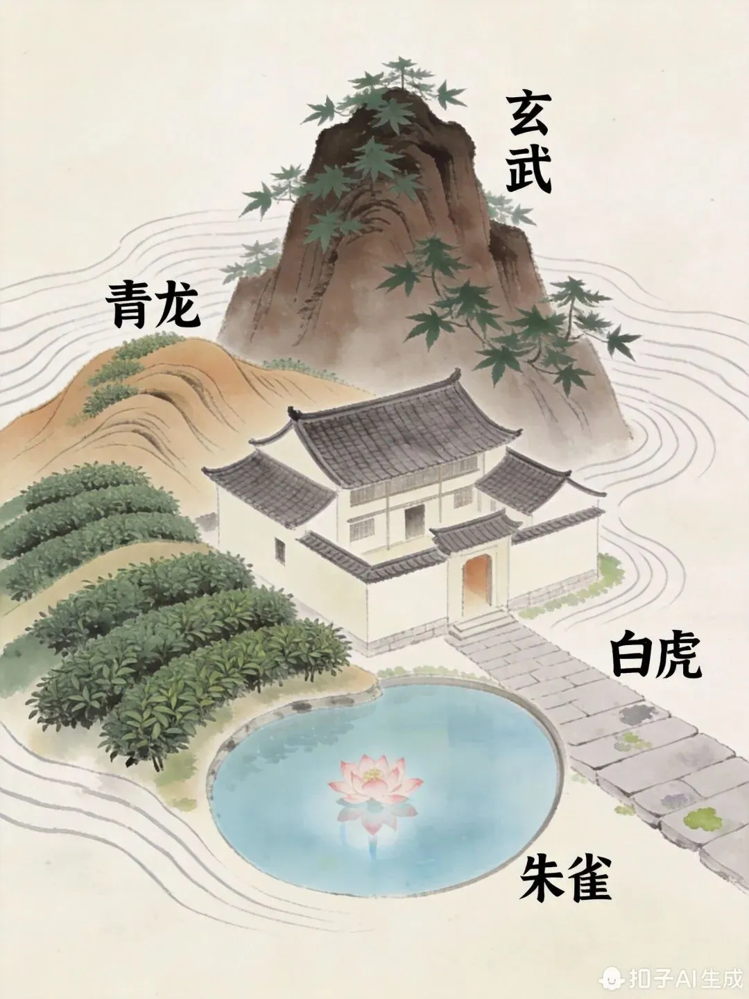 背景:某家族祖宅北方有天然丘陵(壬砂),南方有半月形池塘(丙水),近代家族中多人参军晋升,子孙高考成绩优异。
