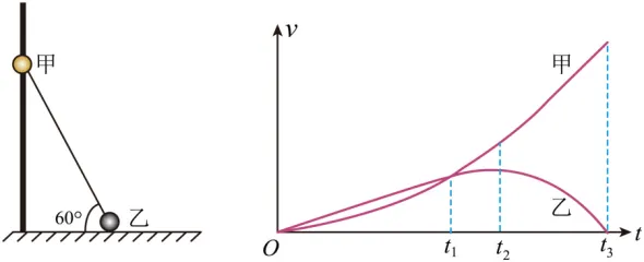例题 【攻坚】可视为质点的甲、乙两小球用铰链与轻杆连接,甲球套在固定的竖直杆上,乙球处于水平地面上,初始时轻杆与水平方向夹角为,杆长为。无初速度释放两球到甲球落地的过程中,两球的速率随时间变化如图所示,其中时刻乙球速率最大。已知甲球质量为,乙球质量为,重力加速度大小为,不计一切摩擦,则( )
