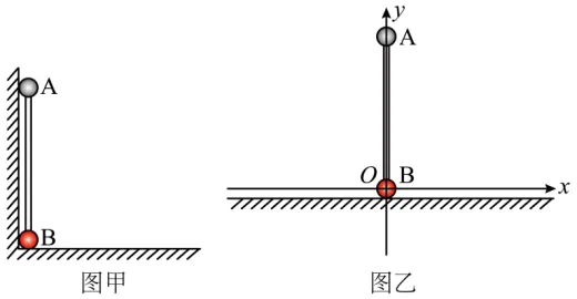 习题5 【强基】如图甲所示,光滑小球 A、B(可视为质点)的质量均为,用长为的轻杆连接后紧靠墙壁竖直立于水平面上,初始时均处于静止状态。现 A 受到轻微扰动向右倾倒(初速度视为 0),两球始终在同一竖直平面内运动,杆与水平方向的夹角为,重力加速度大小为。