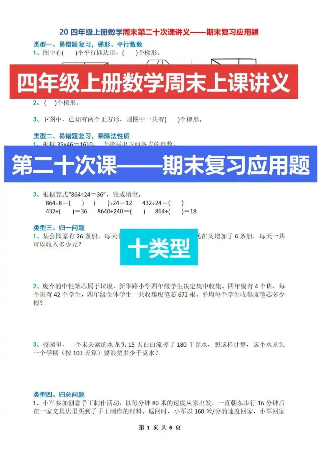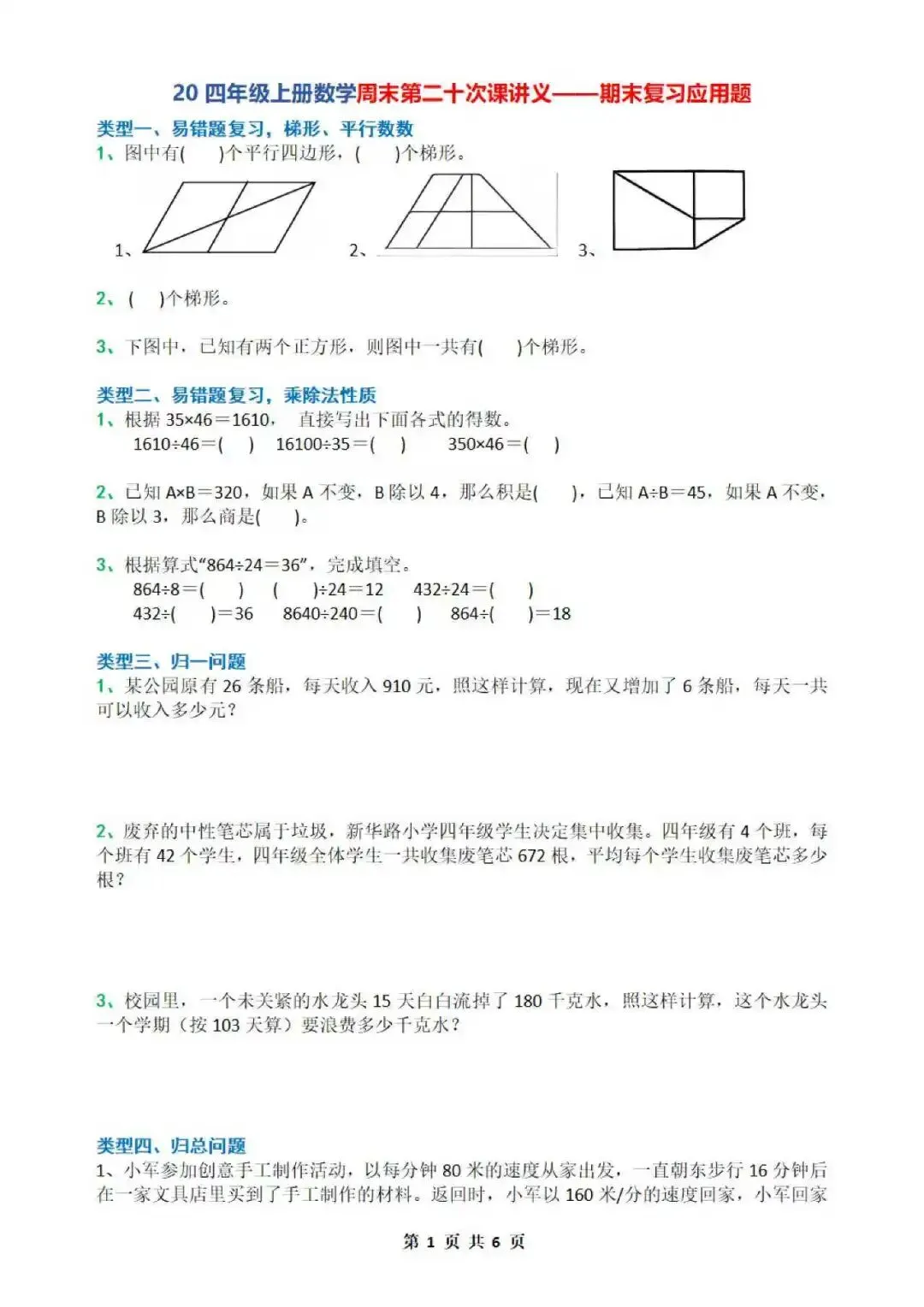 四上数学二十周周末上课讲义期末复习应用题