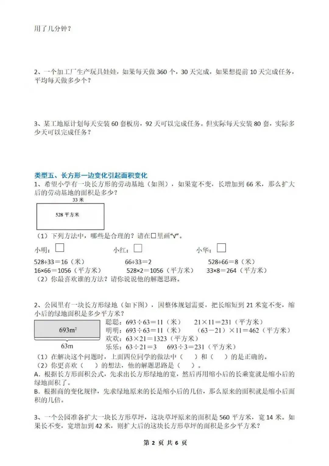 类型五、长方形一边变化引起面积变化